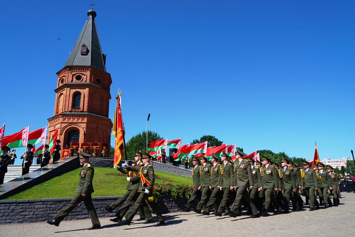 Торжественным маршем прошла колонна парадных расчетов военнослужащих Могилевского гарнизона, а в небе развевался государственный флаг - авиашоу от Могилевского аэроклуба ДОСААФ.
