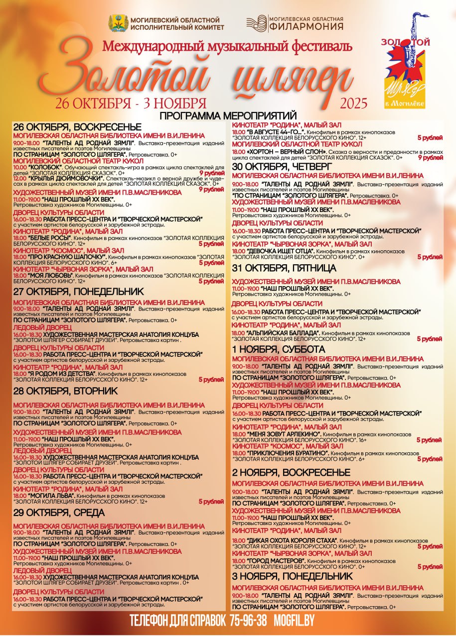 В областной библиотеке имени В.И. Ленина организуют литературно-музыкальную встречу с поэтами Беларуси «Натхнёныя восенню», выставку-презентацию изданий знаменитых поэтов Могилевщины «Таленты ад роднай зямлі» и ретровыставку «По страницам «Золотого шлягера».