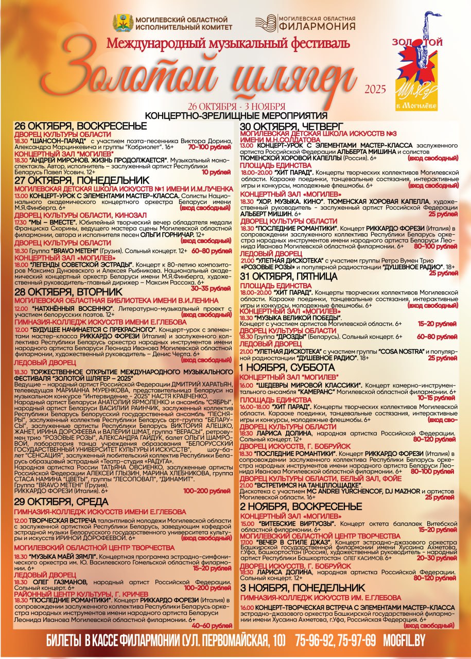 Международный музыкальный фестиваль «Золотой шлягер» состоится в Могилеве с 26 октября по 3 ноября. Его программа будет широкой и разнообразной, а концерты ориентированы на разновозрастную публику с различными музыкальными предпочтениями.
