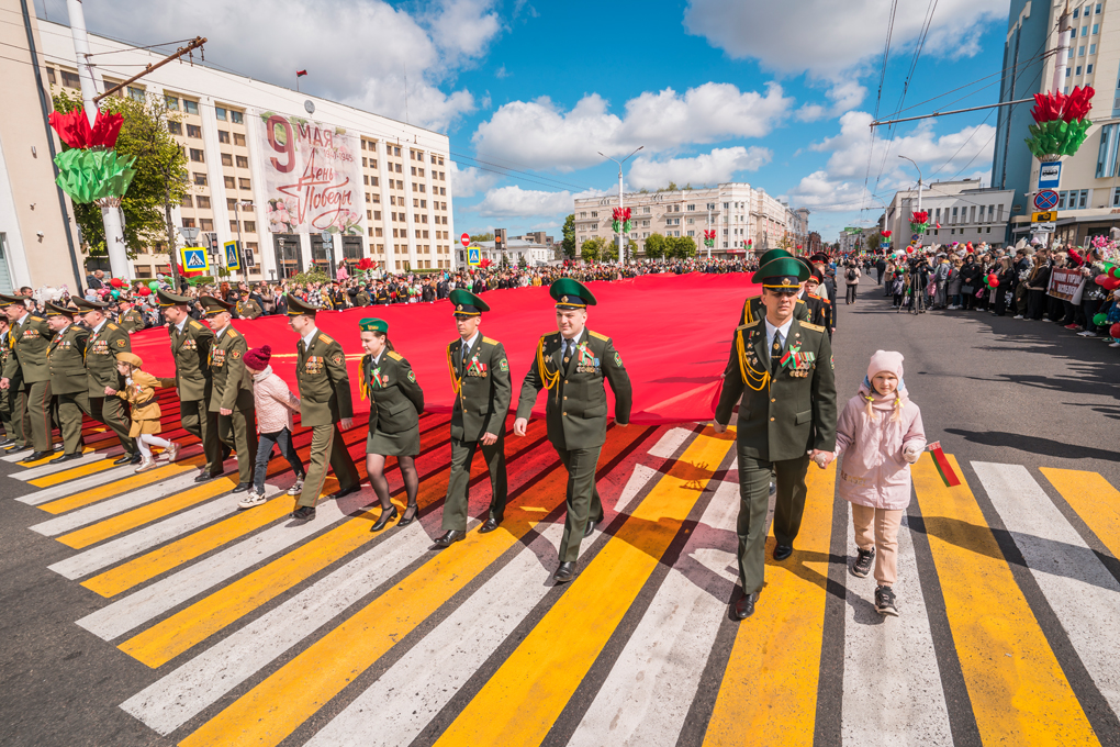 После маршей все направились к площади Славы. Огромное Знамя Победы пронесли участники шествия по центральной улице Могилева - Первомайской.