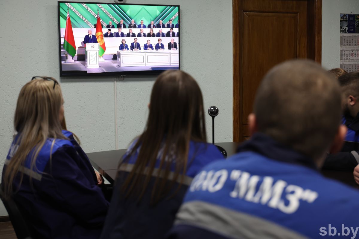 Пока в цехах ОАО «Могилевский металлургический завод» раздавался гул станков, в небольшом уютном конференц-зале воцарилась тишина. Около двадцати человек — от опытных рабочих в спецовках до инженеров и специалистов заводоуправления — собрались у экрана телевизора с прямой трансляцией второго заседания VII Всебелорусского народного собрания.