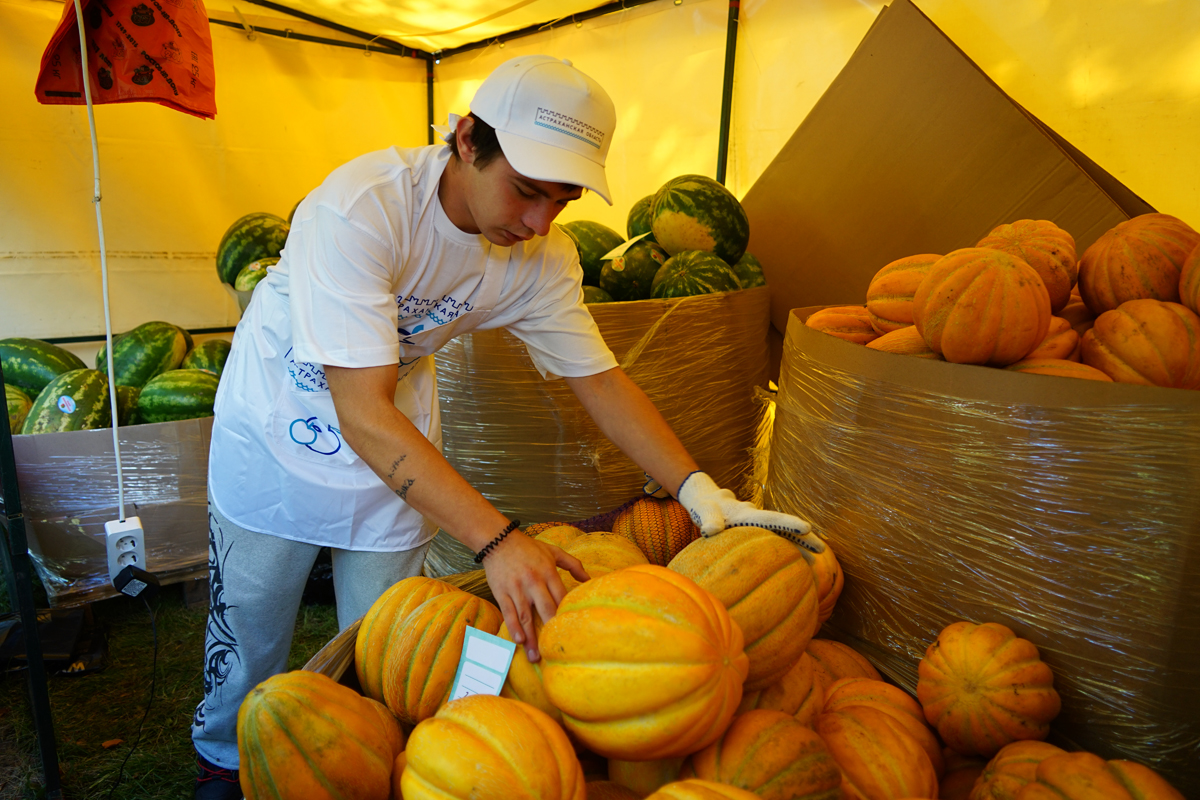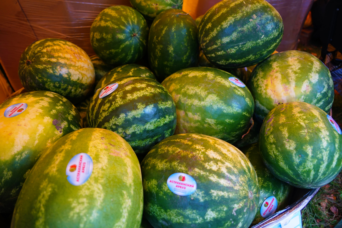 Астраханский край называют арбузной столицей России. Только этой полосатой ягоды фермер из Астрахани Сахиб Вейсов привез целую фуру — это тонн 16. Плюс — четыре фуры дынь, кабачков, баклажанов, томатов, лука. Сахиб уверен, что обратно из Беларуси машины вернутся порожними: