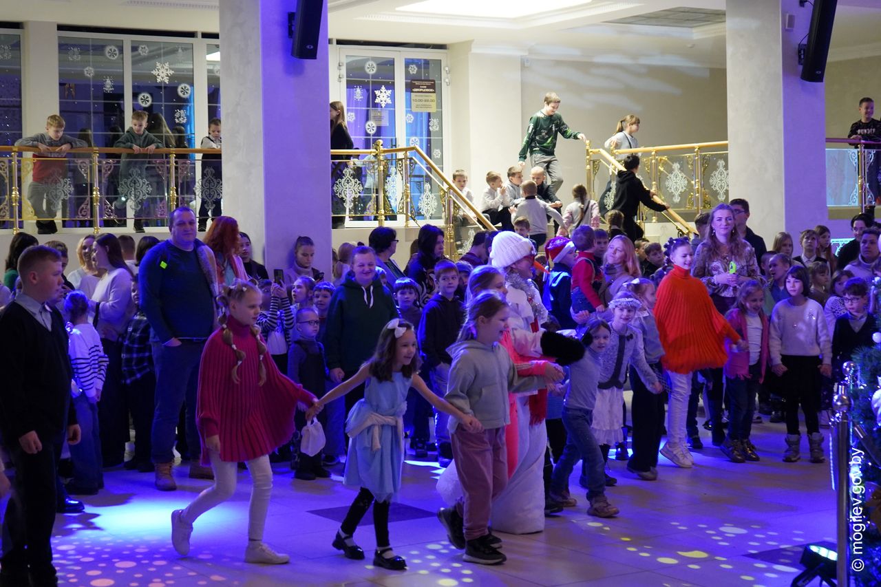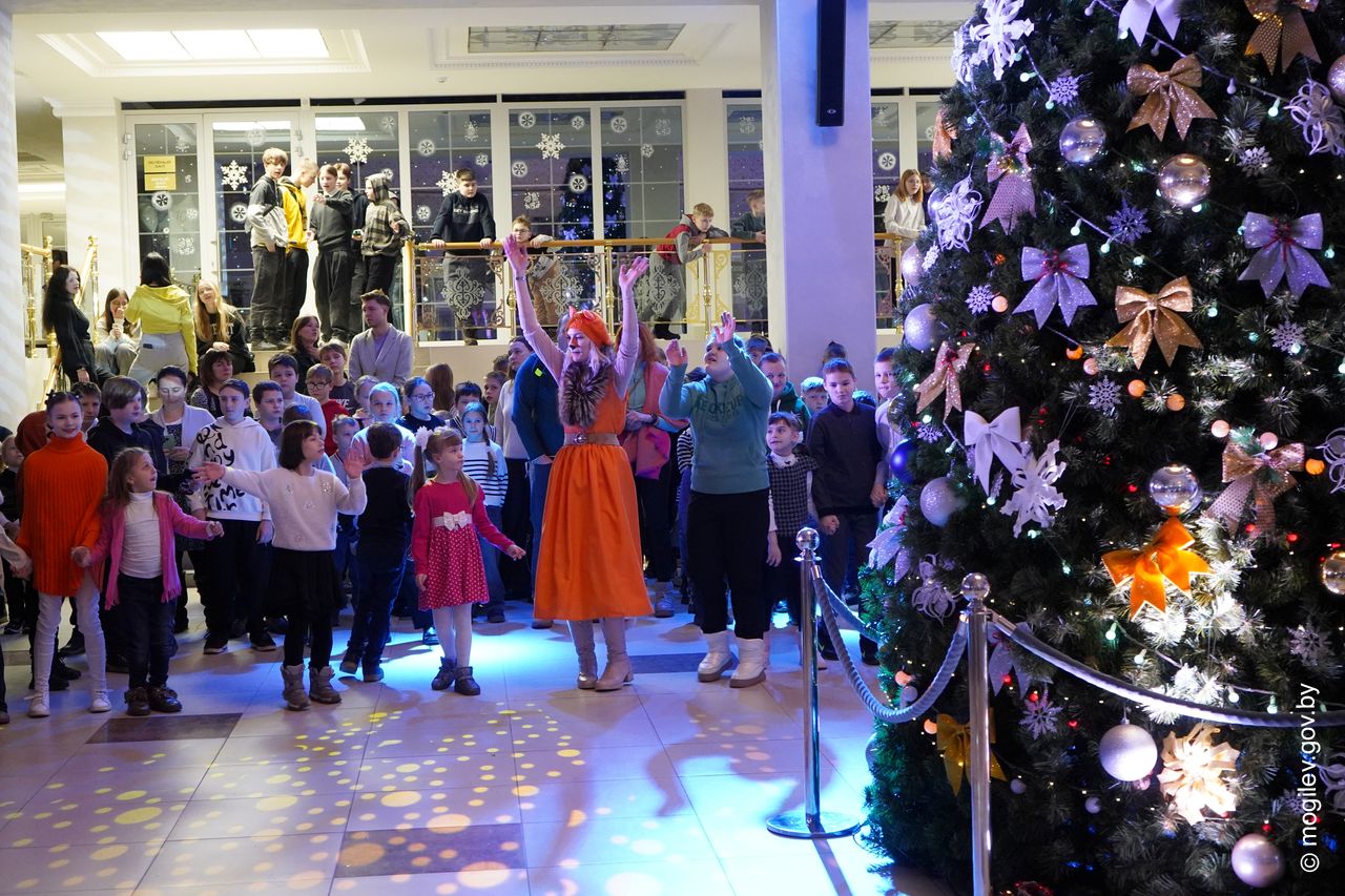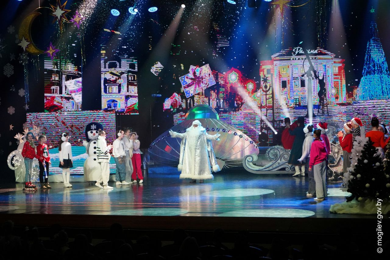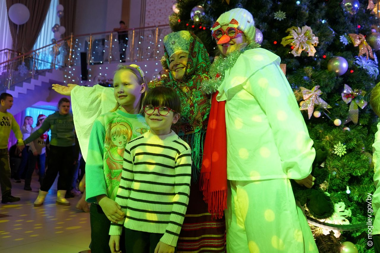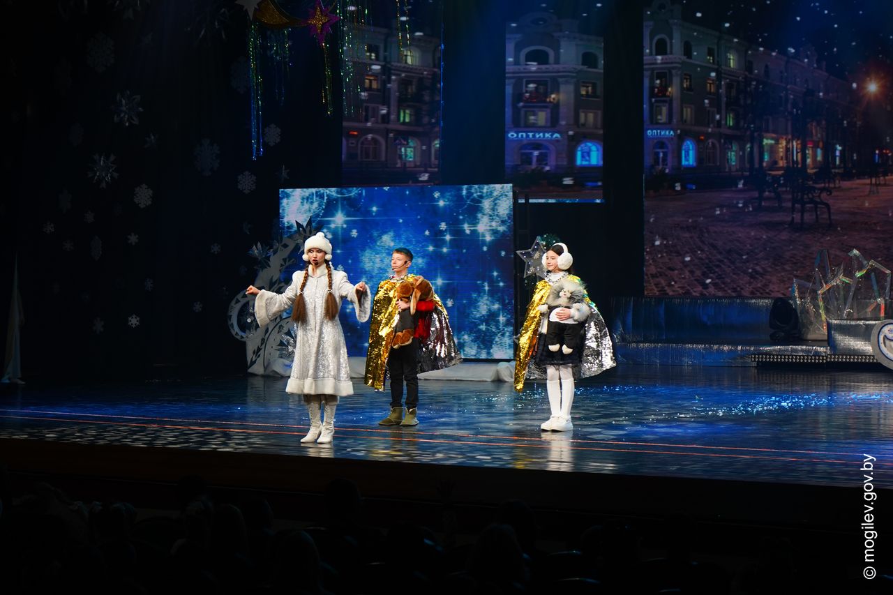 Новогодний праздник в рамках акции «Наши дети» прошел во Дворце культуры области. В этот день юные горожане принимали поздравления с наступающими праздниками и подарки от председателя Могилевского горисполкома Александра Студнева. Затем ребята посмотрели представление «Звездные приключения Снегурочки и ее друзей».