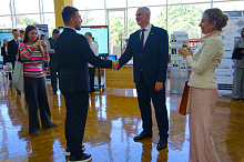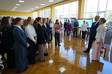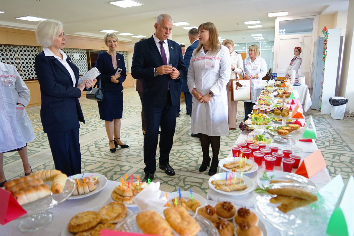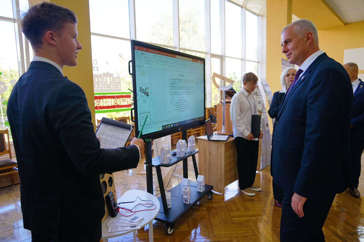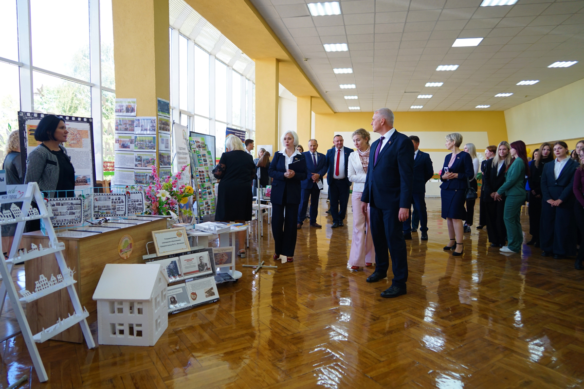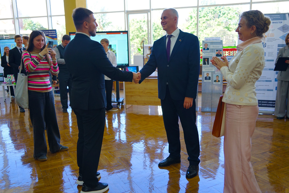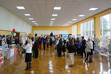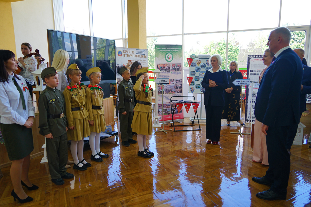 Еще до начала торжественной части на втором этаже Областного центра творчества развернулась выставка учреждений образования Могилева, где проходила презентация лучших педагогических наработок в области образовательной и воспитательной деятельности, а «Комбинат школьного питания» предлагал продегустировать блюда из меню учеников. Председатель горисполкома Сергей Чертков не только внимательно ознакомился с экспозициями, но и в неформальной обстановке пообщался с молодыми педагогами, пополнил копилку акции «Соберем детей в школу».