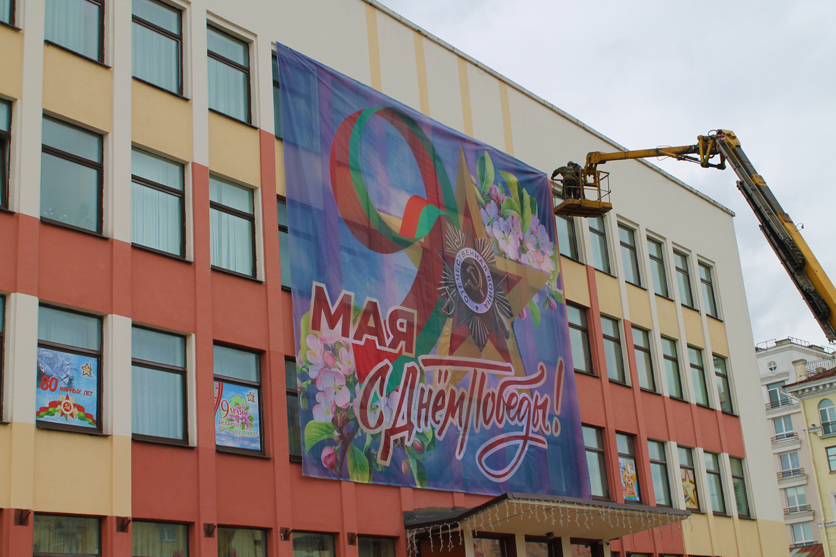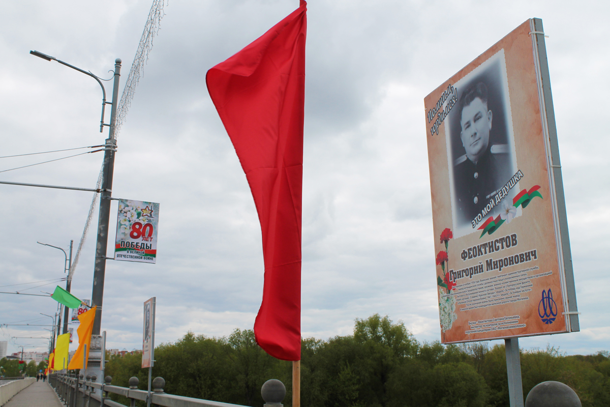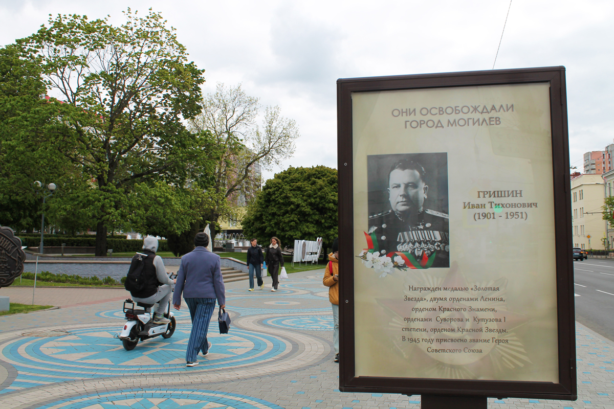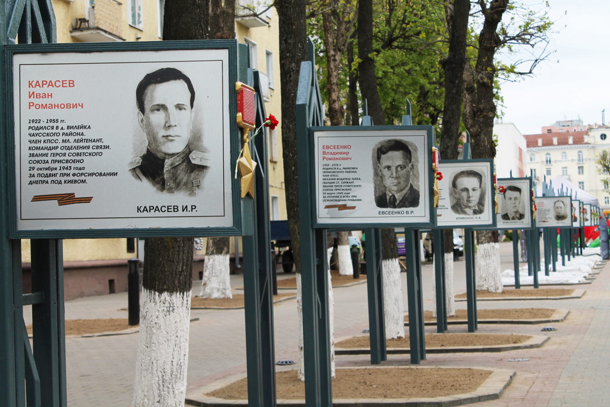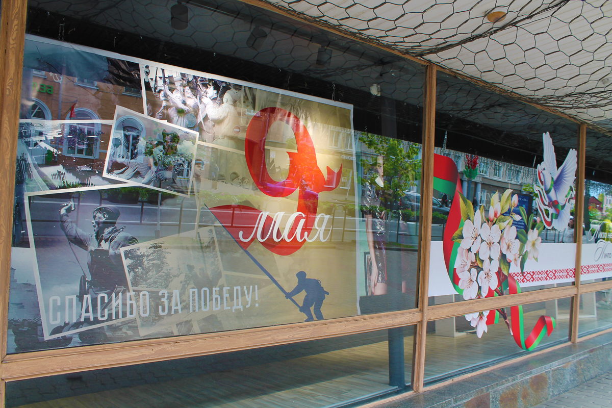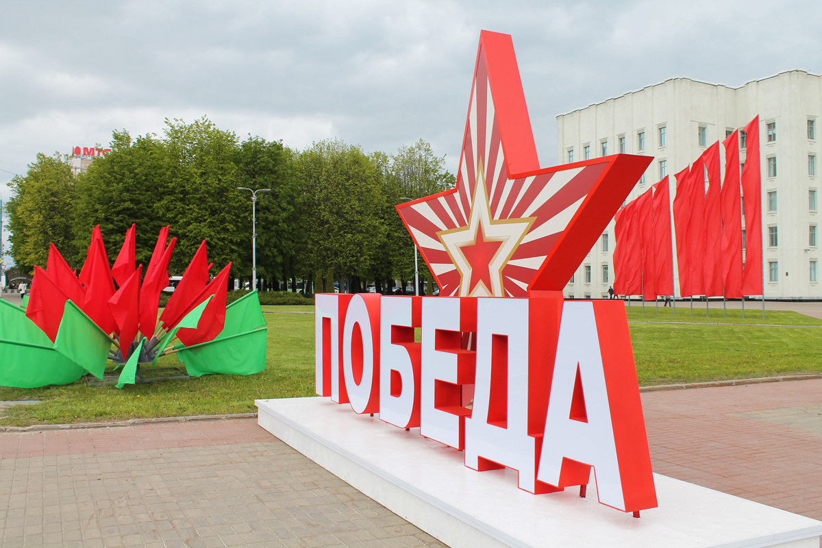 Могилев украсили ко Дню Победы. На улицах появились тематические стенды, фотозоны, панно, растяжки.