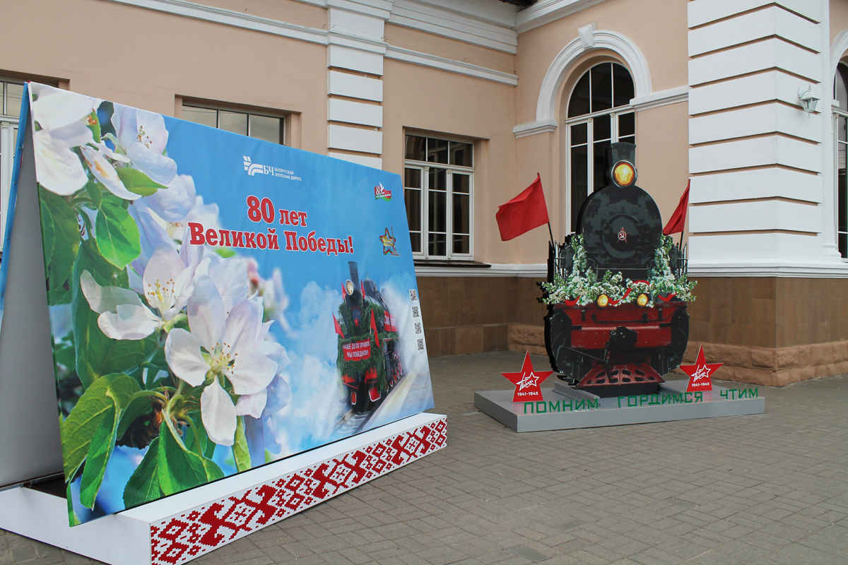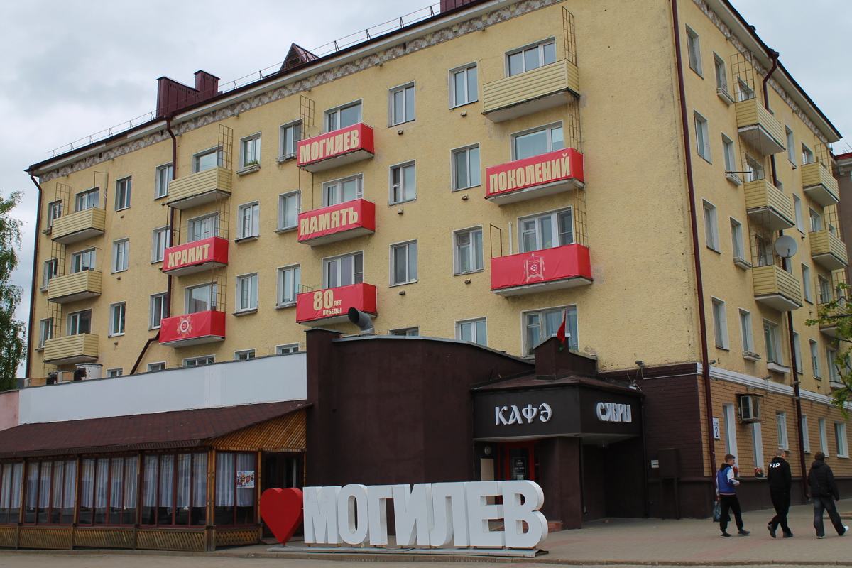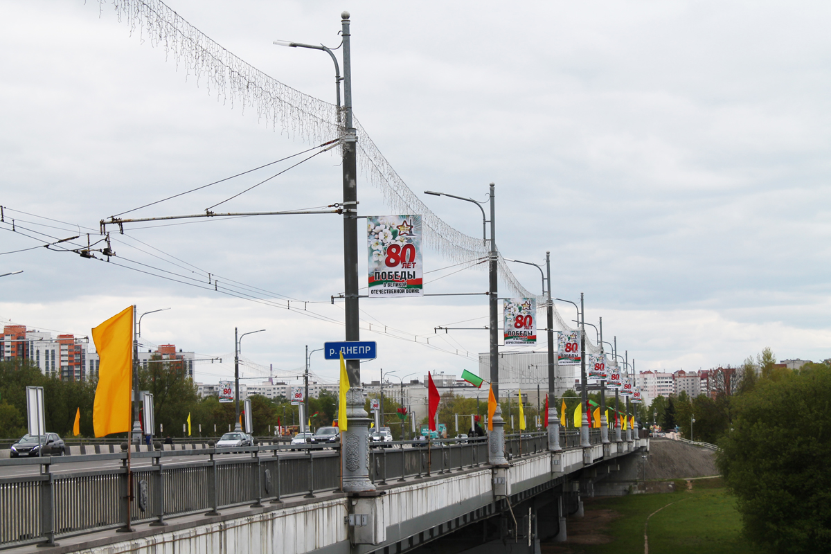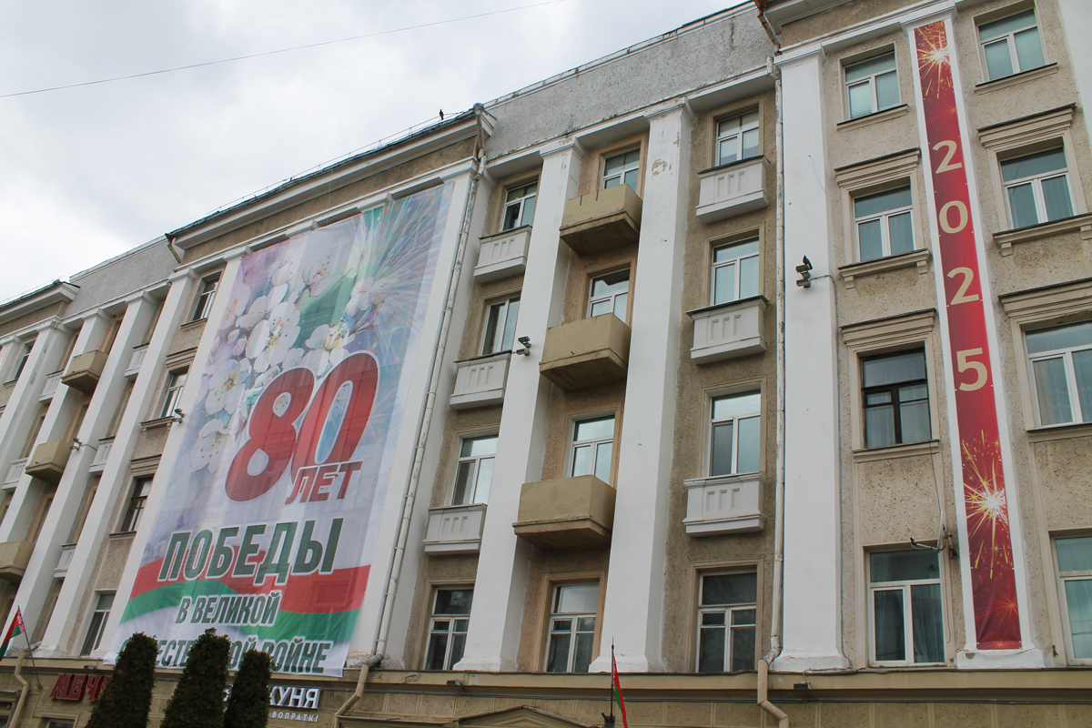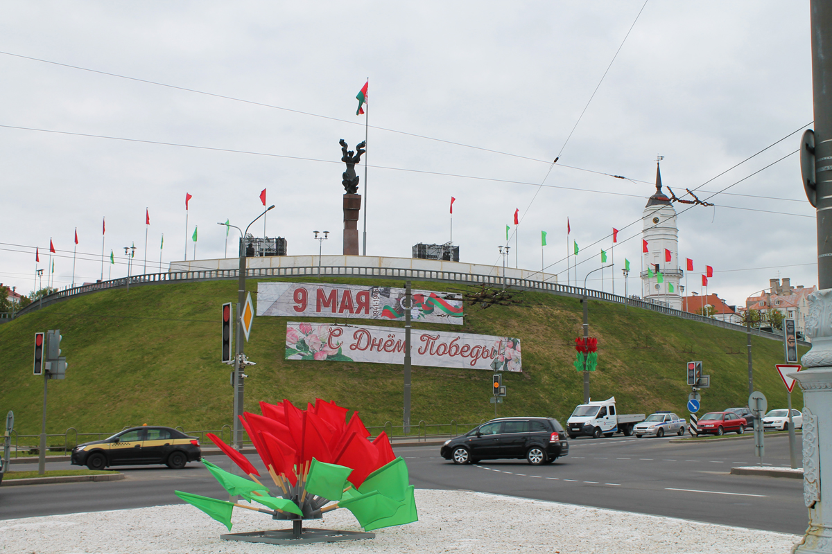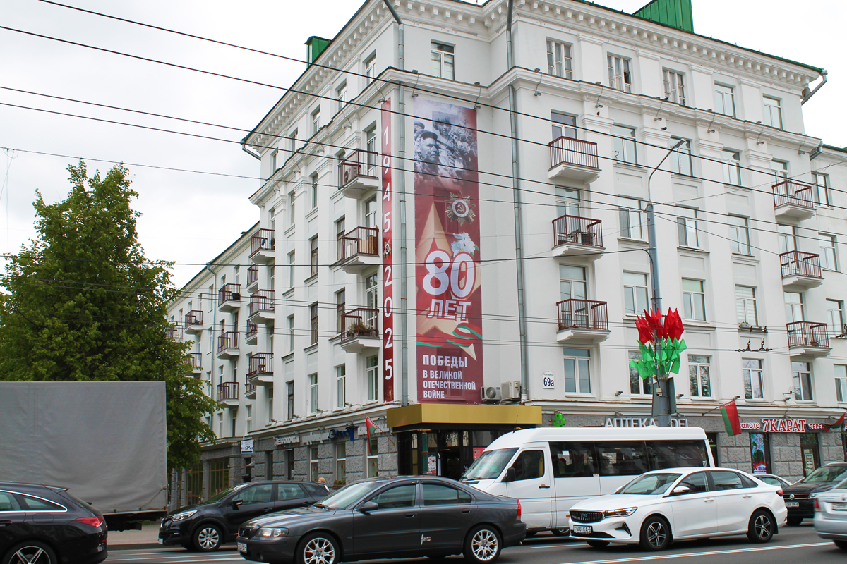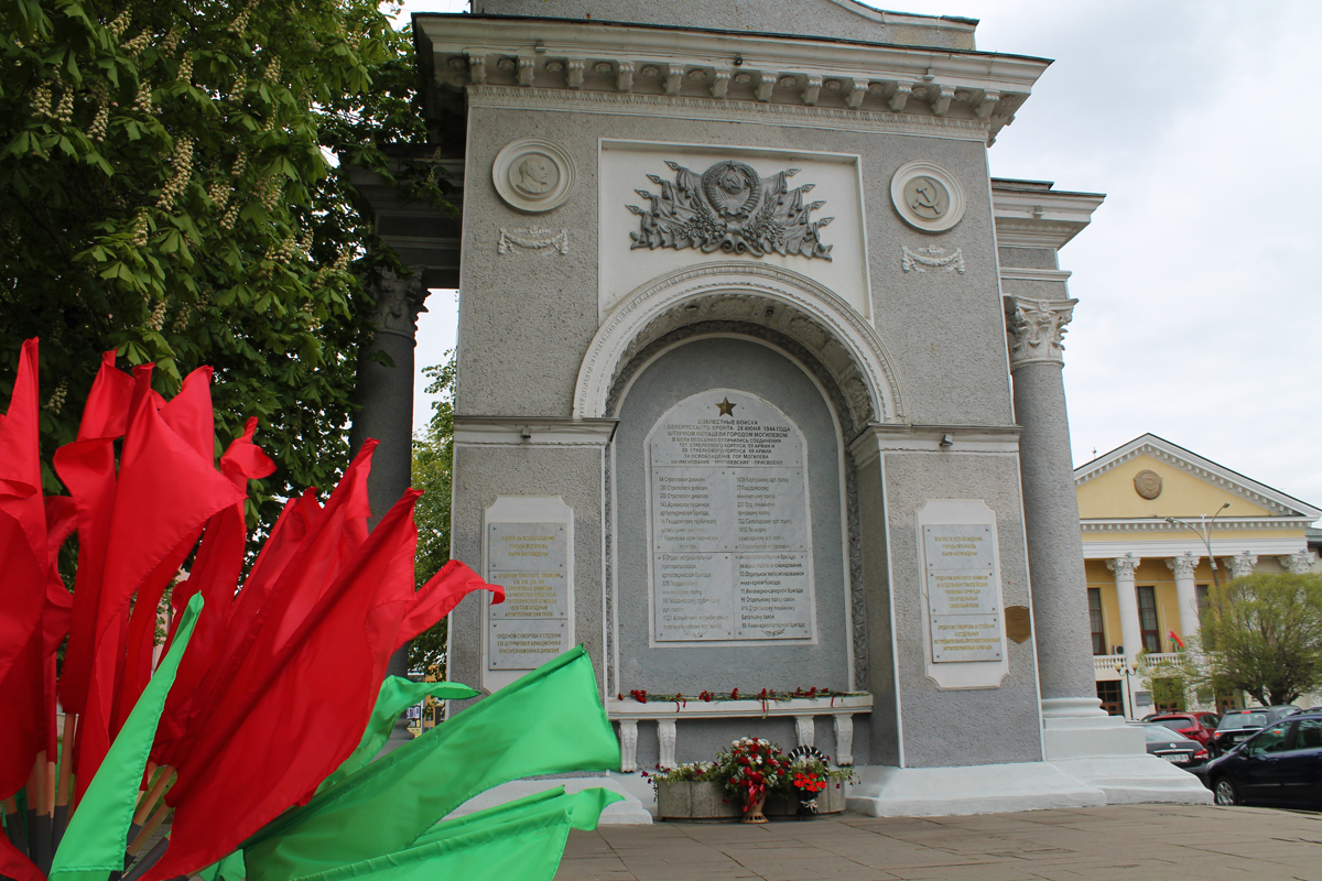 Могилев украсили ко Дню Победы. На улицах появились тематические стенды, фотозоны, панно, растяжки.