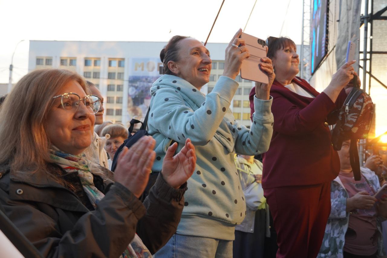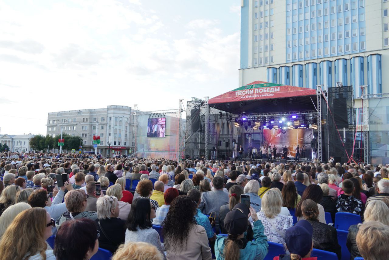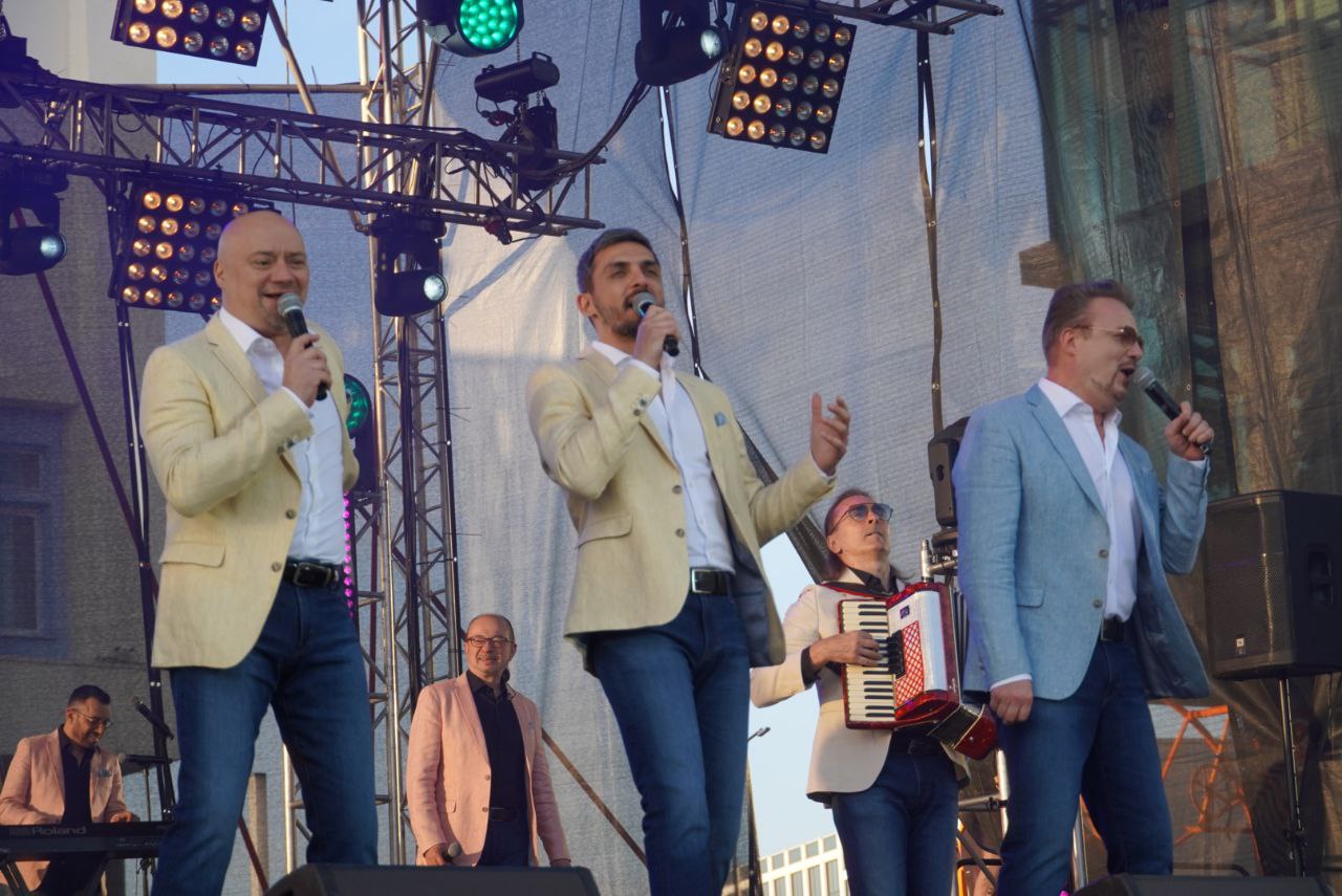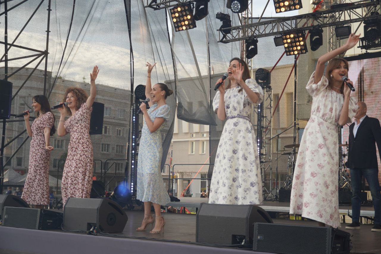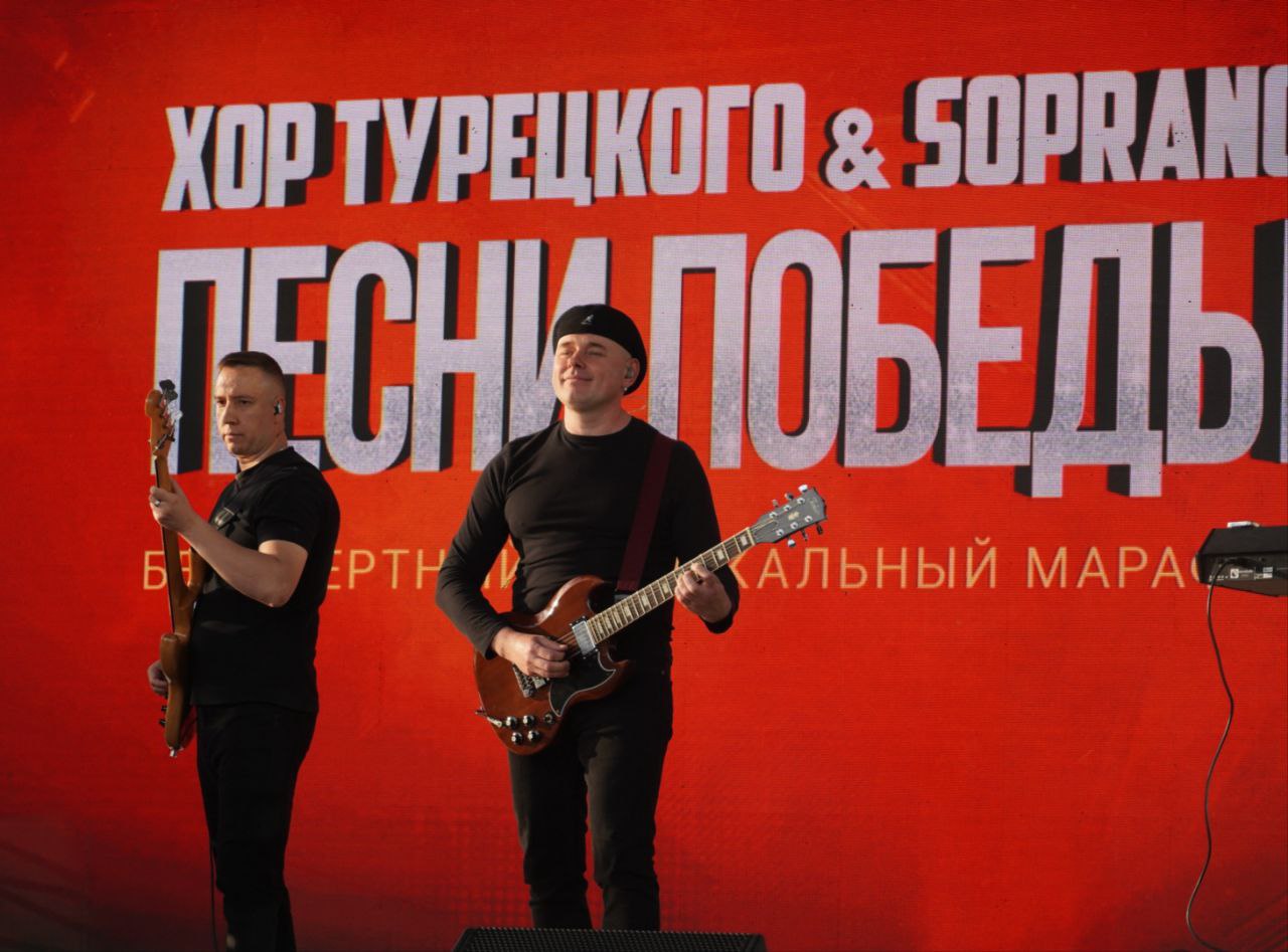 Музыкальный коллектив «Хор Турецкого» выступил на площади Единства в Могилеве с концертной программой «Песни Победы». Со сцены прозвучали искренние и трогательные композиции о мире, подвиге и любви: от пронзительного «Бухенвальдского набата» до всеми любимых «Катюши» и «Смуглянки». Специальным гостем мероприятия стало шоу женских голосов SOPRANO.