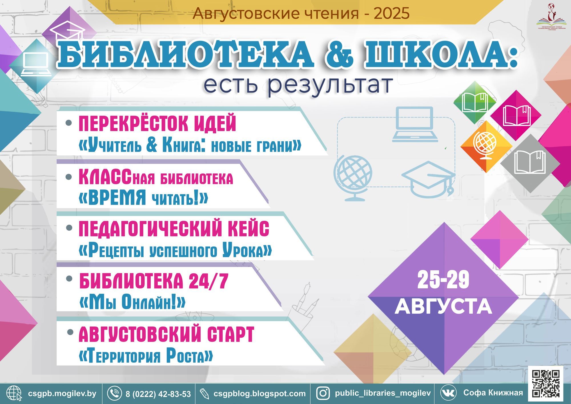 В этом году мероприятие пройдет в формате off/online с 25 по 29 августа под девизом «Библиотека & Школа: есть результат!» и обещает быть полезным и насыщенным, сообщили в УК «Централизованная система государственных публичных библиотек г. Могилева».