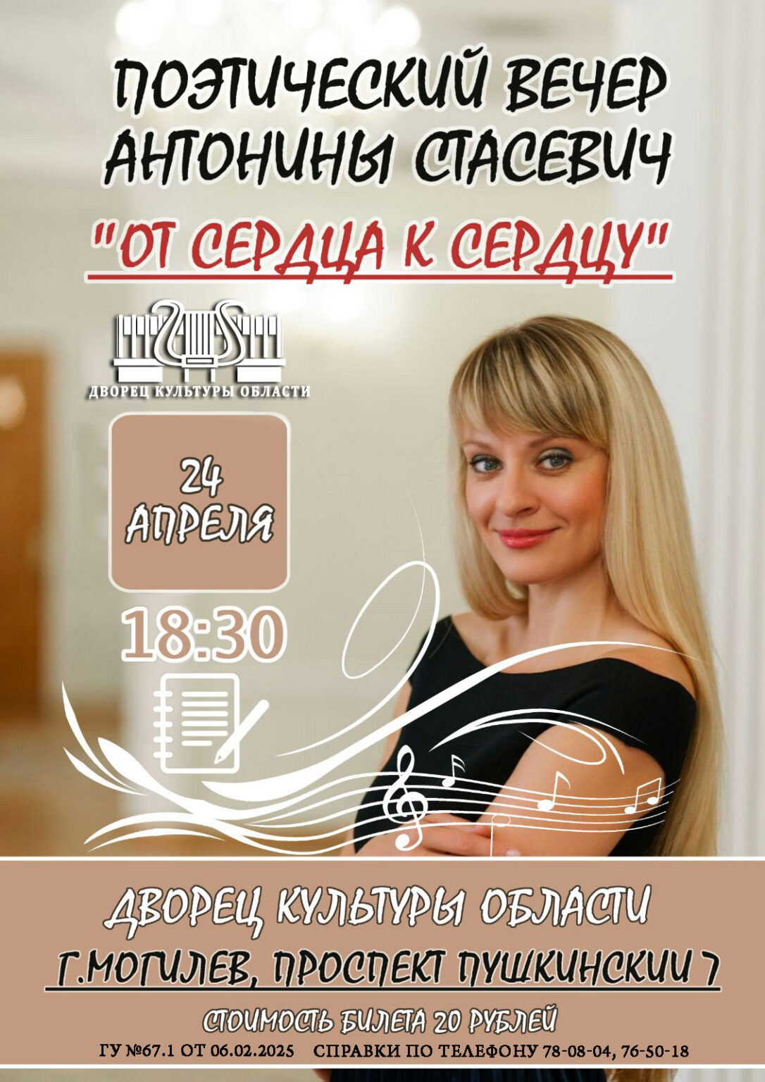 В зале Дворца культуры области сегодня состоится поэтический вечер Антонины Стасевич «От сердца к сердцу». Об этом сообщили в учреждении культуры.