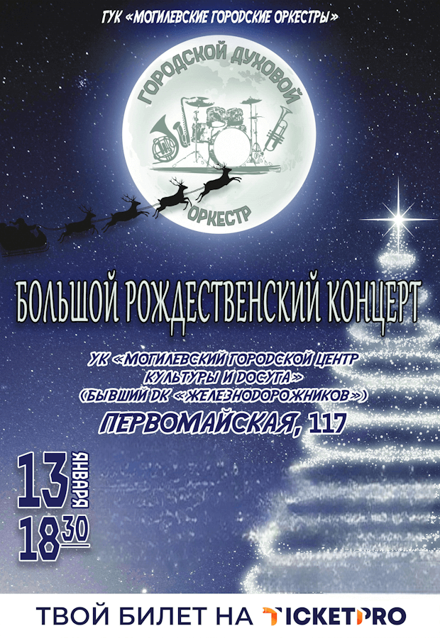 Большой рождественский концерт оркестра духовых инструментов под управлением дирижера Александра Городкова состоится 13 января в Могилеве. Мероприятие пройдет в 18.30 в филиале Городского центра культуры по адресу Первомайская,117 (бывший ДК железнодорожников).