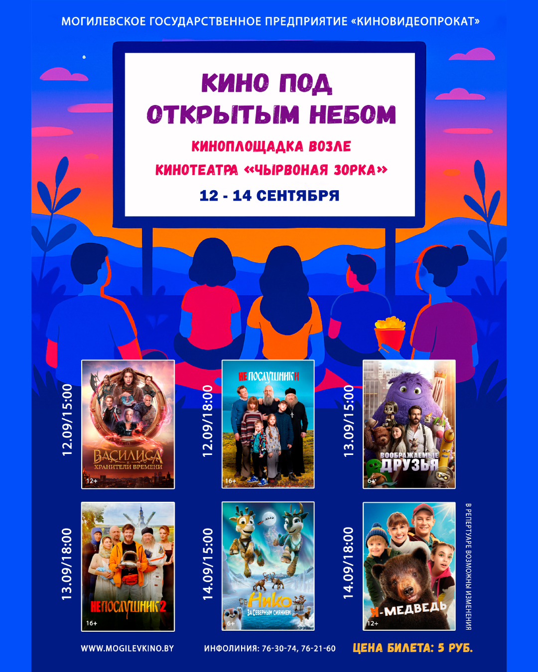 С 12 по 14 сентября Могилевское государственное предприятие «Киновидеопрокат» приглашает на кинопоказы «Кино под открытым небом» у кинотеатра «Чырвоная Зорка».