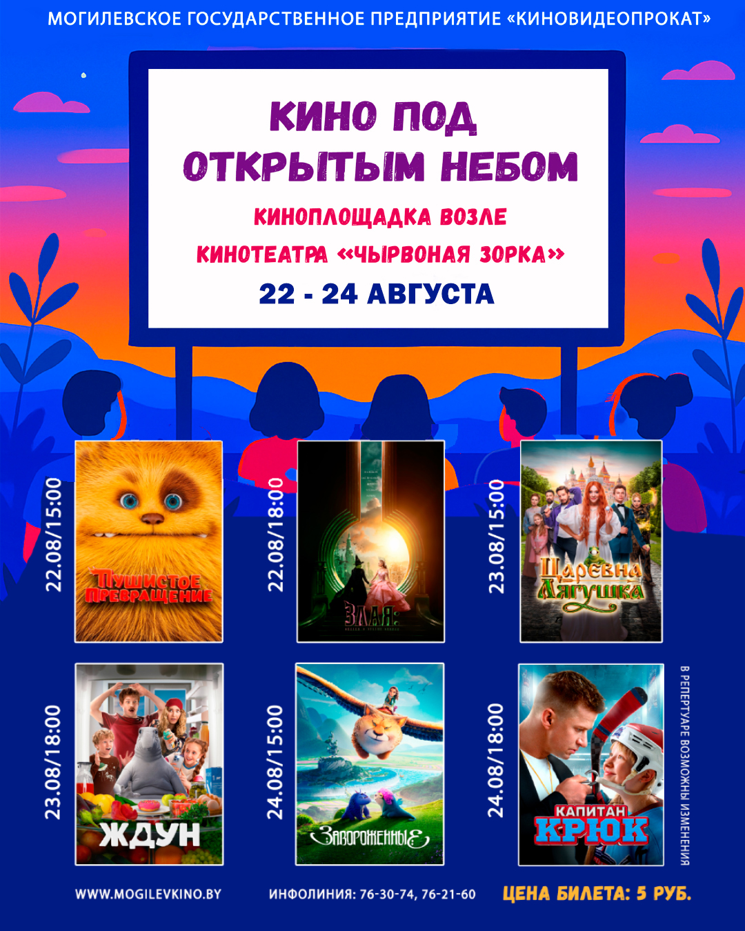 С 22 по 24 августа Могилевское государственное предприятие «Киновидеопрокат» приглашает на кинопоказы «Кино под открытым небом» у кинотеатра «Чырвоная Зорка».