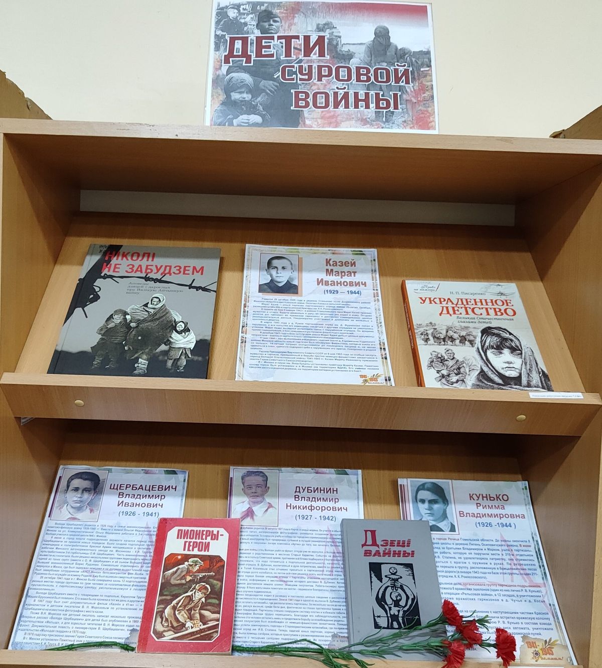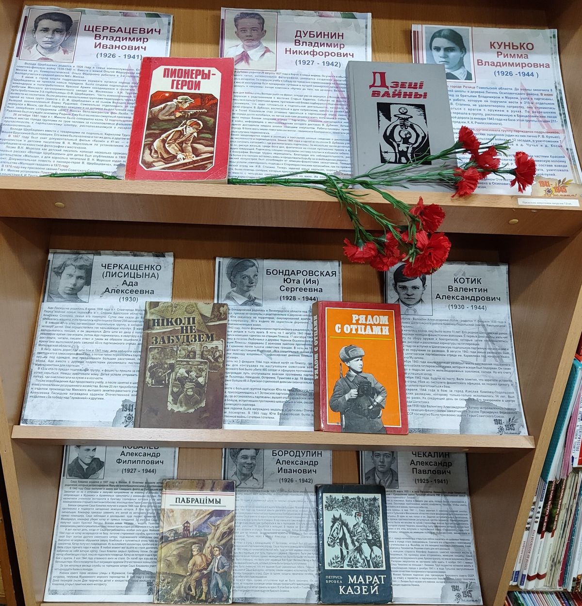 Выставка включает в себя книги и документальные материалы, рассказывающие о подвигах юных героев, чьи судьбы стали символом мужества и патриотизма. Среди них – Валя Котик, Володя Дубинин, Марат Казей, Надя Богданова и многие другие. Одни сражались в партизанских отрядах, передавали важные разведданные, совершали диверсии, другие спасали людей, прятали раненых, оказывали сопротивление оккупантам. Многие из них отдали свои жизни, попав в плен или оказавшись жертвами жестоких расправ. Их мужество и преданность Родине навсегда вписаны в историю.