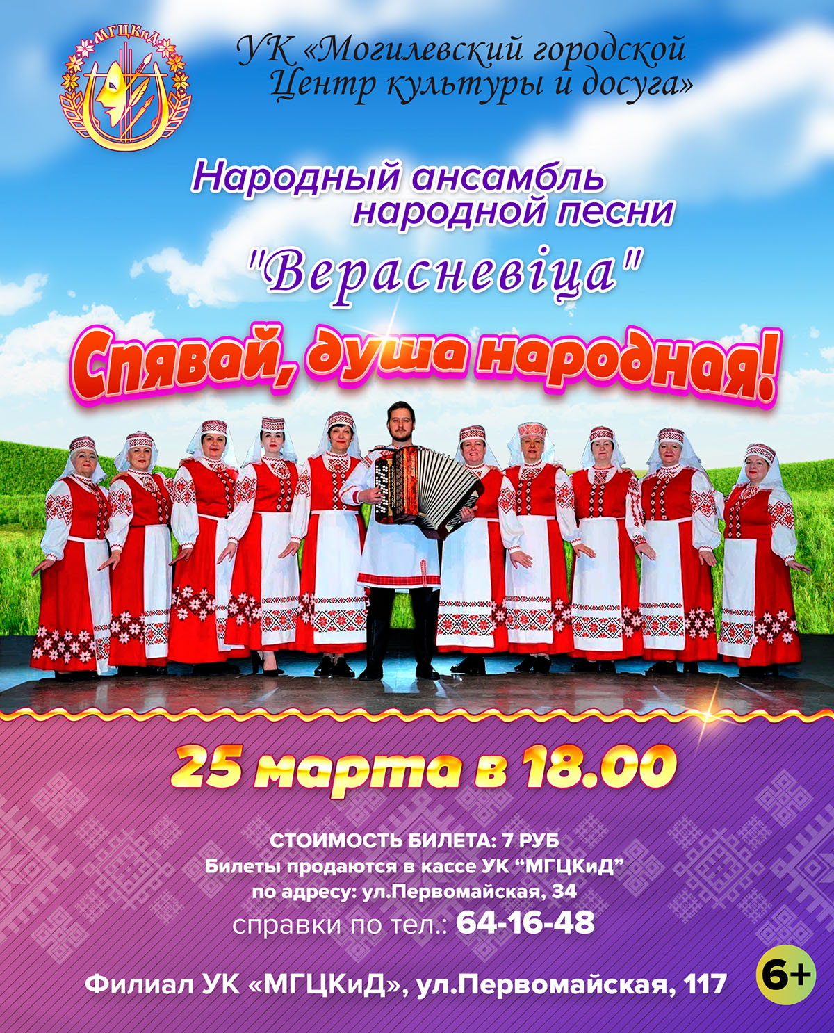 Концерт народного ансамбля народной песни «Вераснёвіца» пройдет в Могилеве 25 марта. Программа под названием «Спявай душа народная» будет представлена в филиале городского центра культуры и досуга (ул.Первомайская, 117).