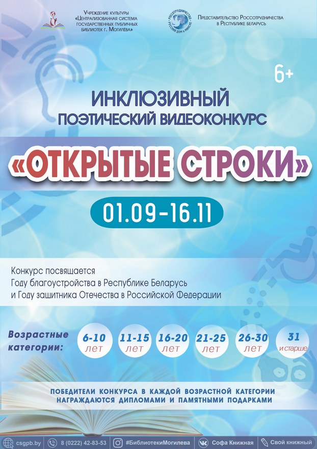 Могилевчан приглашают к участию в инклюзивном поэтическом видеоконкурсе «Открытые строки», который проводится в рамках Года благоустройства в Беларуси и Года защитника Отечества в России.