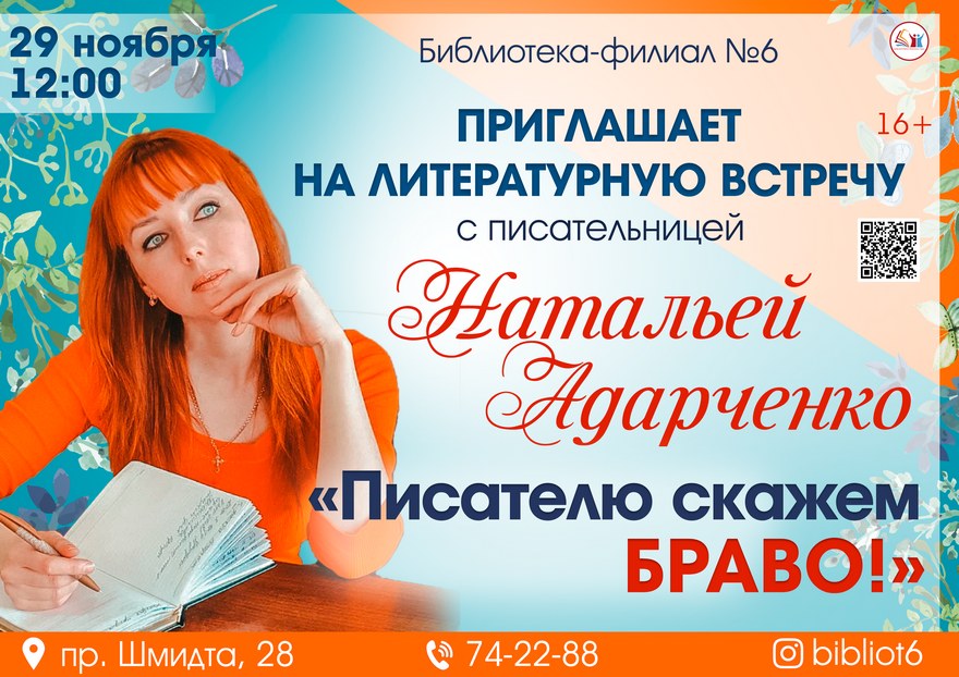 В библиотеке-филиале №6 29 ноября состоится литературная встреча «Писателю скажем БРАВО!». В гостях – современная белорусская писательница Наталья Адарченко с презентацией новой книги для подростков «Планы на жизнь». Не упустите возможность провести время творчески в атмосфере живого слова и глубоких смыслов!
