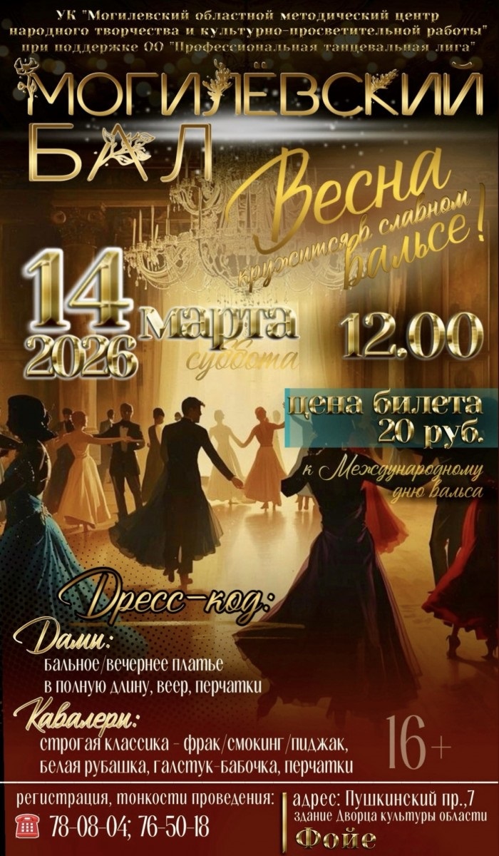 Совершить изящное путешествие во времени и стать частью самого романтичного события сезона 14 марта приглашают могилевчан. В здании областного методического центра народного творчества и культурно-просветительной работы днем состоится могилевский бал «Весна кружится в славном вальсе!». В программе — танцы разных народов и эпох: вальсы, контрдансы, кадрили, полонез, круговые танцы.