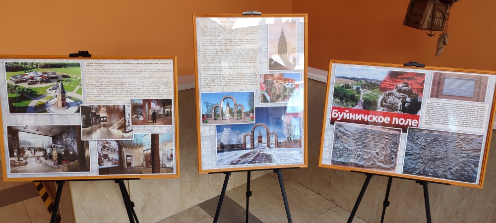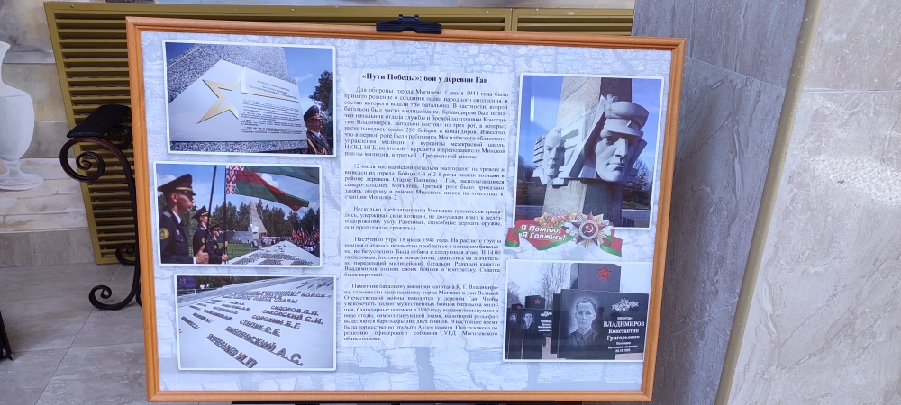 В экспозиции представлены информационные материалы и архивные фотографии, рассказывающие об обороне Могилева, трагедии деревни Борки, подвиге батальона Владимирова у деревни Гаи, геноциде белорусского народа в годы Великой Отечественной войны. Также зрителей здесь встречает декоративная инсталляция «Буйничское поле».
