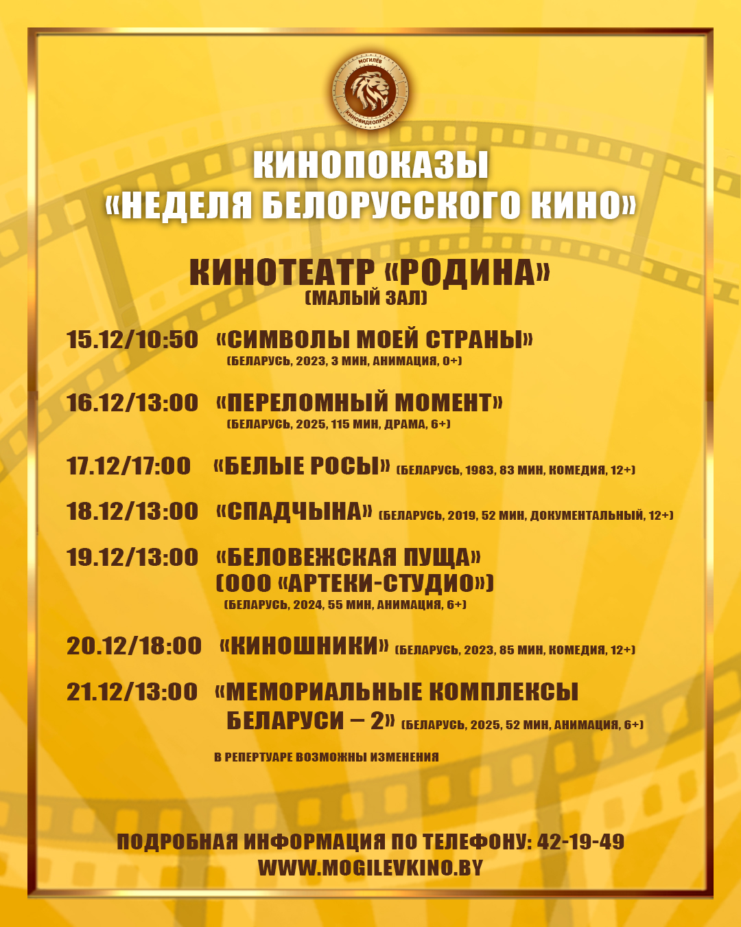 Как рассказали в Могилевском областном производственном унитарном предприятии «Киновидеопрокат», яркие, разножанровые ленты, которые знакомят с богатыми традициями белорусского кинематографа, будут демонстрировать в кинотеатрах «Родина», «Чырвоная Зорка» и «Космос».