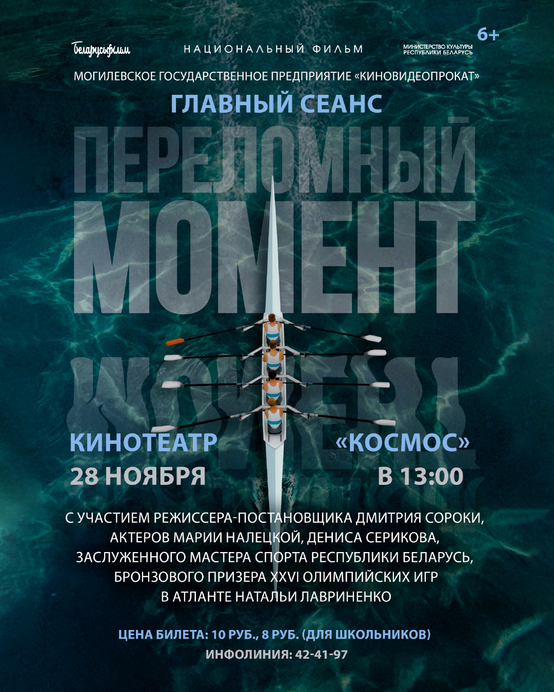 Могилевское государственное предприятие «Киновидеопрокат» 28 ноября приглашает в кинотеатр «Космос» на главный сеанс премьерного фильма «Переломный момент» производства УП «Национальная киностудия «Беларусьфильм». Мероприятие пройдет при участии режиссера-постановщика Дмитрия Сороки, актеров Дениса Серикова, Марии Налецкой и заслуженного мастера спорта Беларуси, бронзового призера XXVI Олимпийских игр в Атланте в 1996 года в составе восьмерки распашной, победителя Кубка мира в составе четверки парной в 1999 года Натальи Лавриненко.