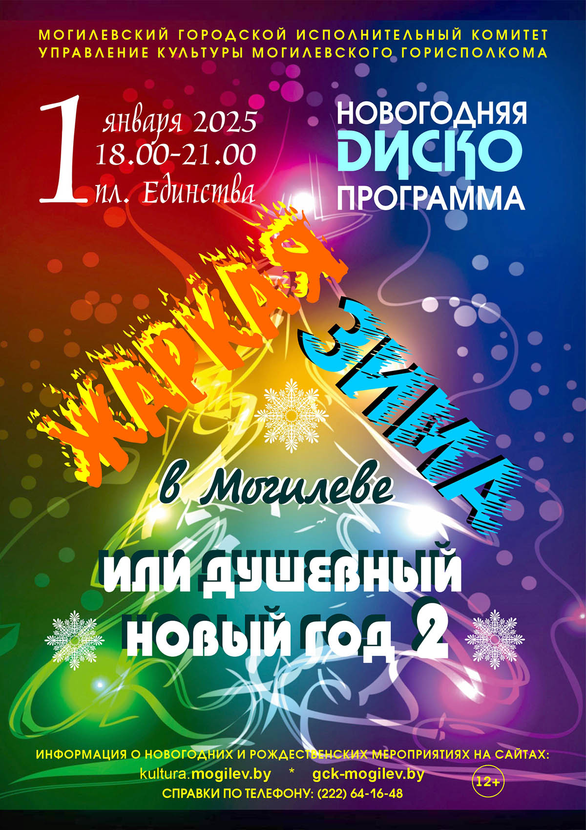 В атмосферу настоящего зимнего праздника и веселья можно окунуться и вечером 1 января. С 18.00 до 21.00 на площади Единства будет организована диско-программа «Жаркая зима в Могилеве или душевный Новый год-2». В программе – «Танцплощадка от «Душевного радио» и Дмитрия Санковича, артиста Евгения Ермолковича, кавер-группы «Брэнд Бэнд».