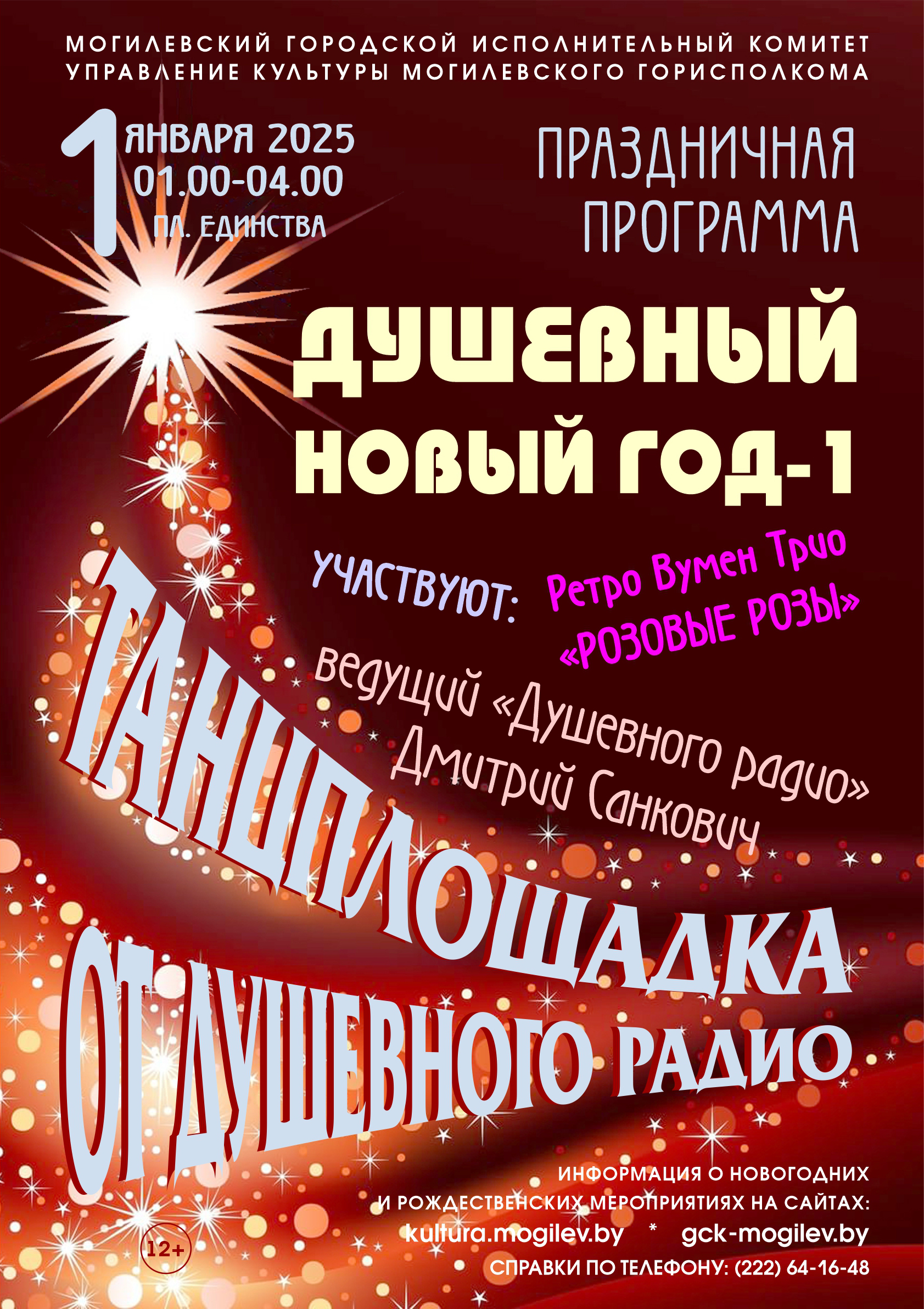 – 1 января приглашаем могилевчан на праздничную программу «Душевный Новый год-1» на площади Единства, – рассказали в управлении культуры. – С 1.00 до 4.00 здесь будет работать «Танцплощадка от «душевного радио» с участием Ретро Вумен Трио «Розовые розы» и ведущего «Душевного радио» Дмитрия Санковича.