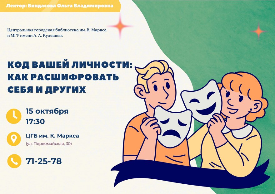 Центральная городская библиотека им. К. Маркса продолжает цикл очных встреч с преподавателями психологии из МГУ имени А.А. Кулешова. Очередная беседа состоится 15 октября в 17.30 на тему «Код вашей личности: как расшифровать себя и других».