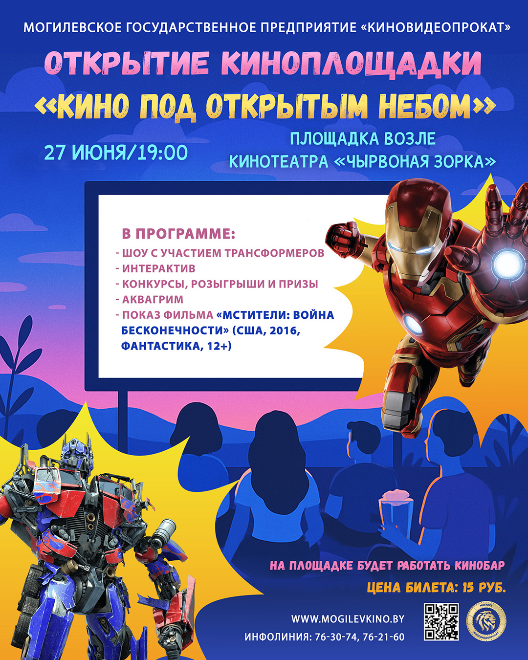 Как сообщается на сайте предприятия «Киновидеопрокат», в программе - шоу с участием трансформеров, интерактивы, конкурсы, розыгрыши и призы, аквагрим, показ фильма «Мстители: Война бесконечности».
