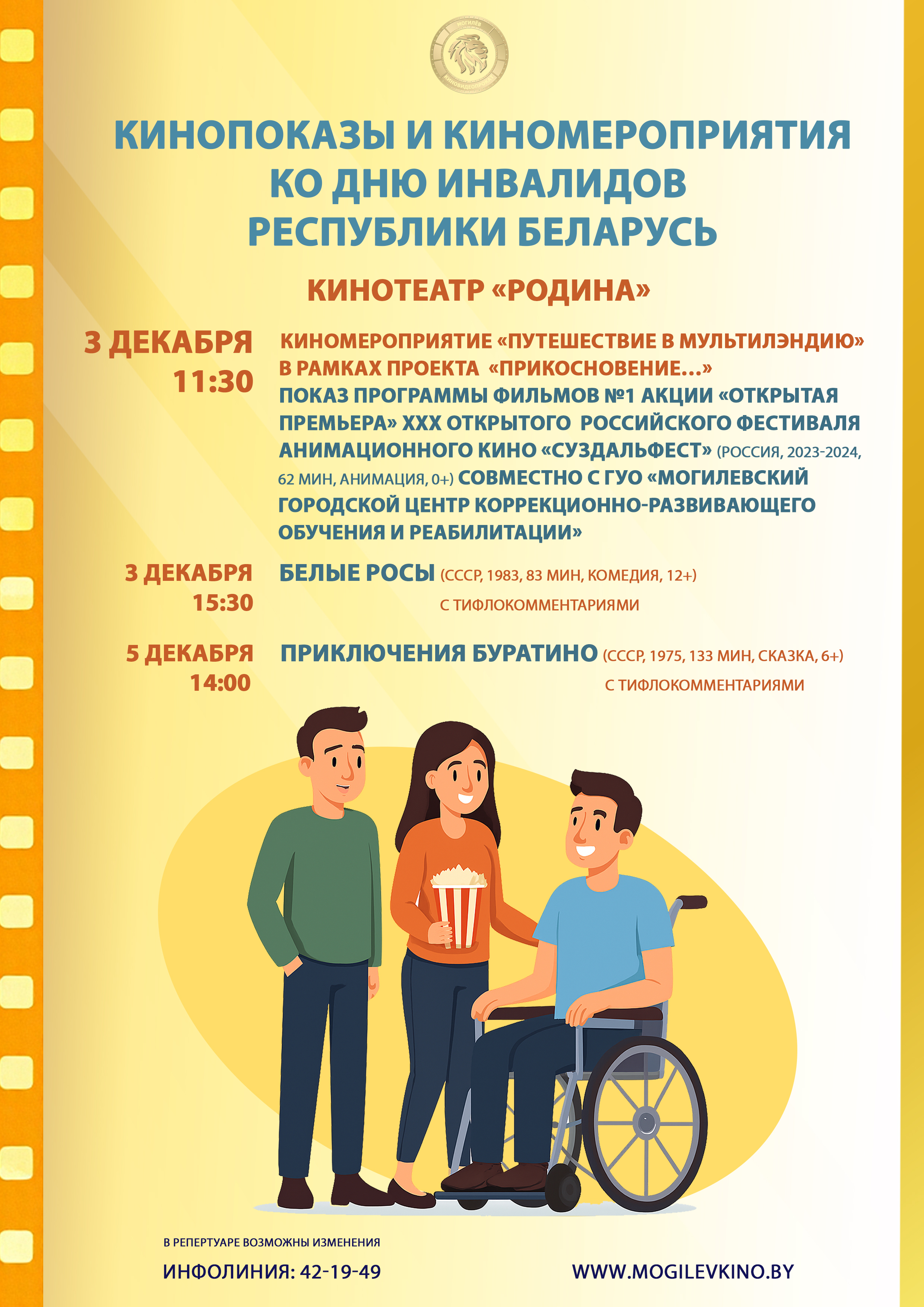 Кинотеатр «Родина» 3 и 5 декабря приглашает на кинопоказы и киномероприятия ко Дню инвалидов Республики Беларусь.