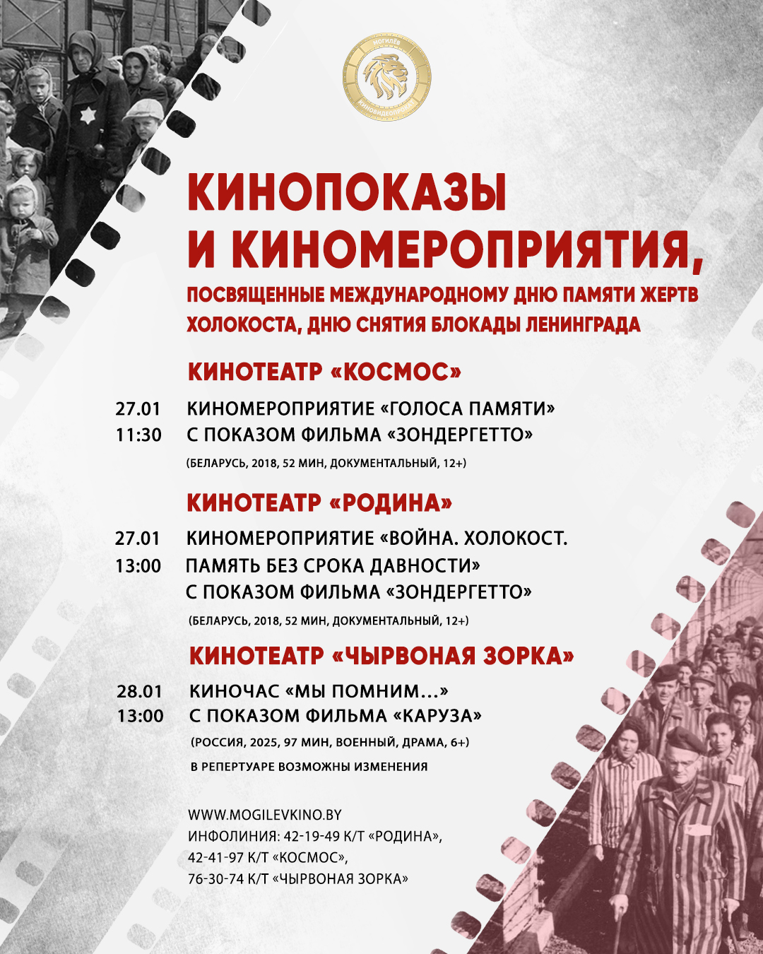 Могилевское государственное предприятие «Киновидеопрокат» 27 и 28 января приглашает на кинопоказы и киномероприятия, посвященные Международному дню памяти жертв Холокоста, Дню снятия блокады Ленинграда.