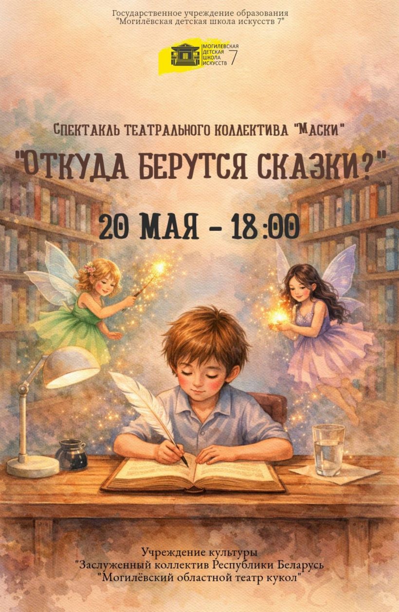 Могилевский областной театр кукол 20 мая в 18.00 приглашает на спектакль «Откуда берутся сказки?», который покажут воспитанники театрального коллектива «Маски» ГУО «Могилевская детская школа искусств №7».
