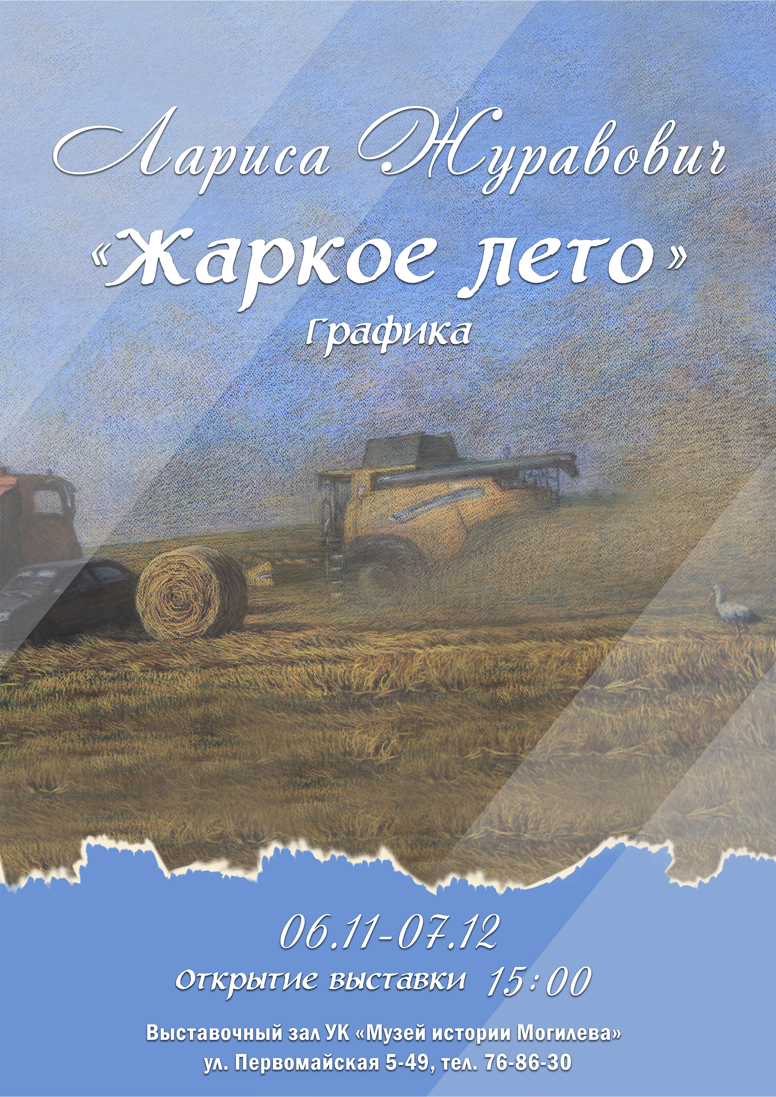 Персональная выставка Ларисы Журавович откроется 6 ноября в выставочном зале УК «Музей истории Могилева». Экспозиция под названием «Жаркое лето» включает более 60 работ, которые являются свидетельством многолетнего кропотливого труда с ярко выраженным индивидуальным стилем художницы. Ее произведения – это признание в любви к своей малой Родине. И этой любовью она делится со всеми.