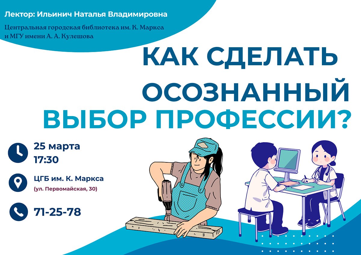 Встреча открытого психологического лектория на тему «Как сделать осознанный выбор профессии?» состоится в Могилеве 25 марта. Мероприятие пройдет в Центральной городской библиотеке им. К.Маркса (ул.Первомайская, 30).
