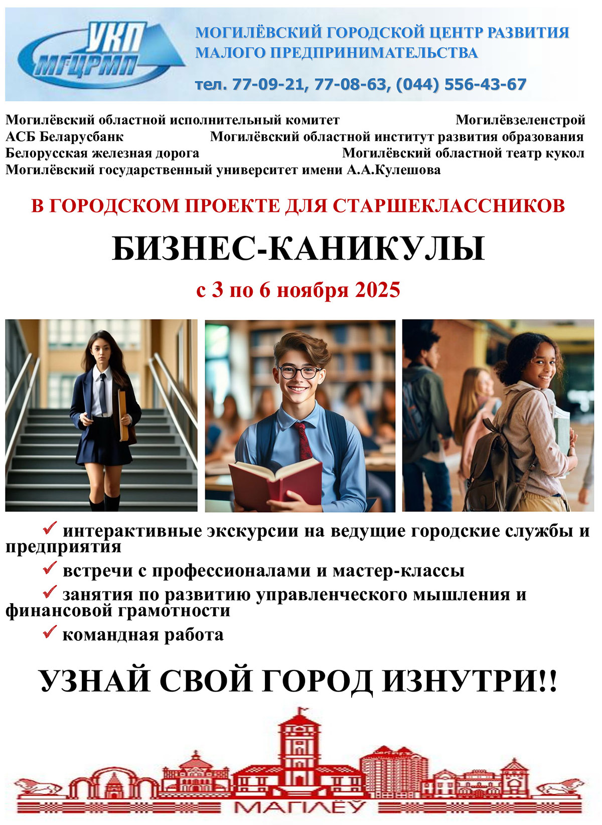 В Могилеве с 3 по 6 ноября пройдет городской проект для старшеклассников «Бизнес-каникулы». Его организатором выступает Центр развития малого предпринимательства.