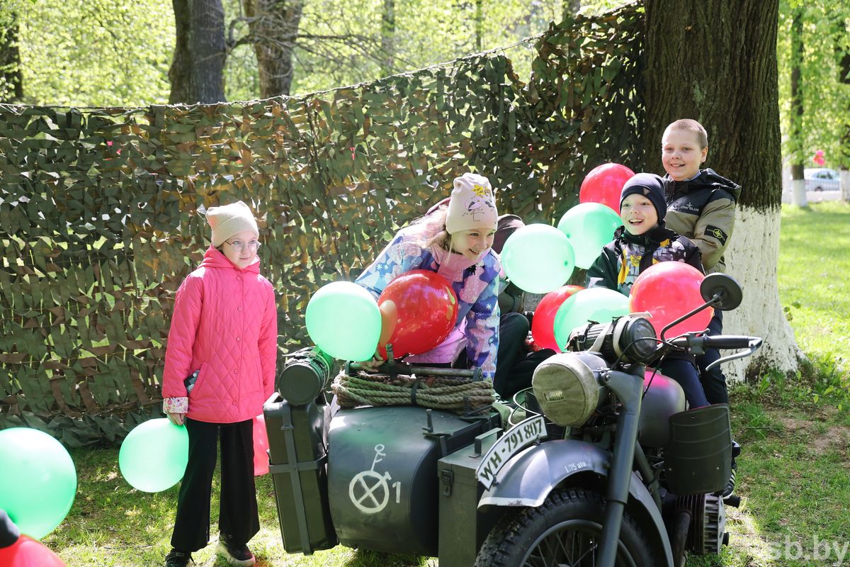 Стартовав от школы, колонна проследовала к Мемориальному комплексу «Буйничское поле», где прошла церемония возложения. После участник вернулись к школе на основную локацию. Праздничный концерт, выставка оружия и техники, реконструкция боя, акция «Вальс Победы» — ребятам было интересно. Байкеры не только продемонстрировали мастерство вождения, но и подарили радость детям, покатав их на своих мотоциклах. К технике выстроилась очередь из желающих, среди которых и четвероклассница Евгения Абрамова. Девочка поделилась эмоциями: