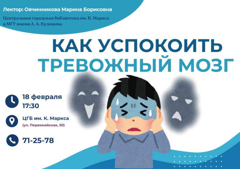Центральная городская библиотека им. К.Маркса продолжает цикл очных встреч с преподавателями психологии из МГУ имени А.А. Кулешова. Очередная состоится 18 февраля в 17.30 на тему «Как успокоить тревожный мозг».