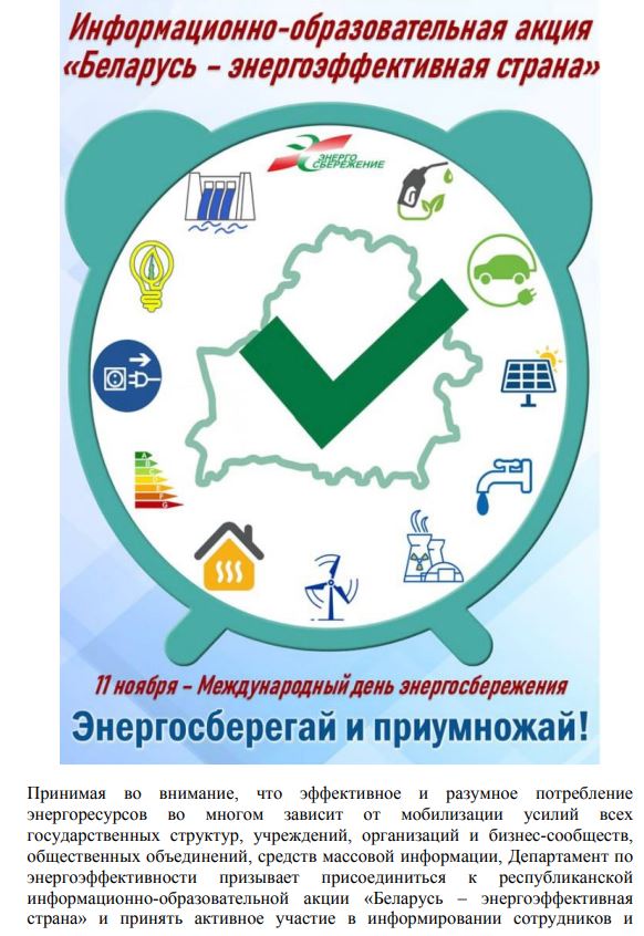 Департамент по энергоэффективности с 10 по 20 ноября проведет республиканскую информационно-образовательную акцию «Беларусь - энергоэффективная страна», приуроченную к Международному дню энергосбережения, который ежегодно отмечается 11 ноября. Об этом сообщили в департаменте.