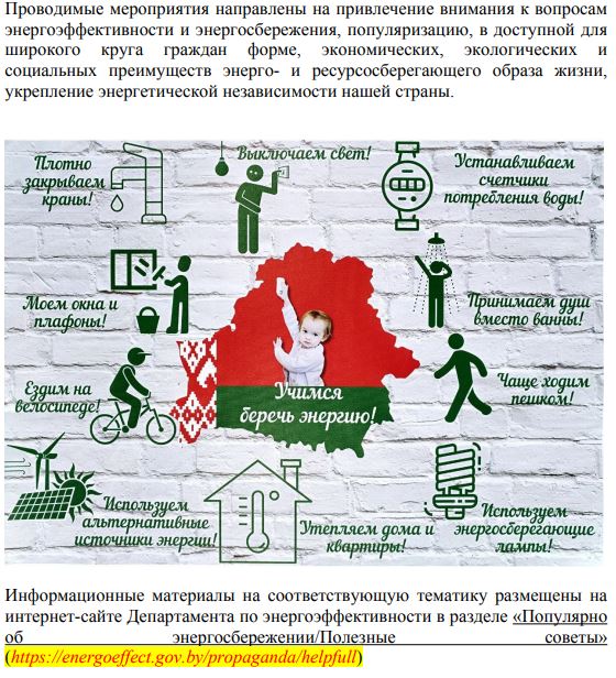 «Эффективное и разумное потребление энергоресурсов во многом зависит от мобилизации усилий всех государственных структур, учреждений, организаций и бизнес-сообществ, общественных объединений, средств массовой информации. Департамент по энергоэффективности призывает присоединиться к республиканской информационно-образовательной акции «Беларусь - энергоэффективная страна» и принять активное участие в информировании сотрудников и общества о важности энергоэффективности и способах энергосбережения в быту», - отметили в департаменте.