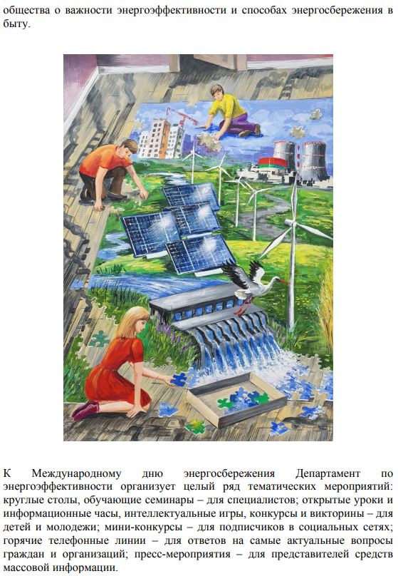 Кроме того, к Международному дню энергосбережения Департамент по энергоэффективности организует целый ряд тематических мероприятий. В том числе круглые столы, обучающие семинары для специалистов, открытые уроки и информационные часы, интеллектуальные игры, конкурсы и викторины для детей и молодежи, мини-конкурсы для подписчиков в социальных сетях, интервью, пресс-мероприятия для представителей СМИ. Также представители территориальных органов департамента в областных центрах и Минске проконсультируют по вопросам в сфере энергосбережения.