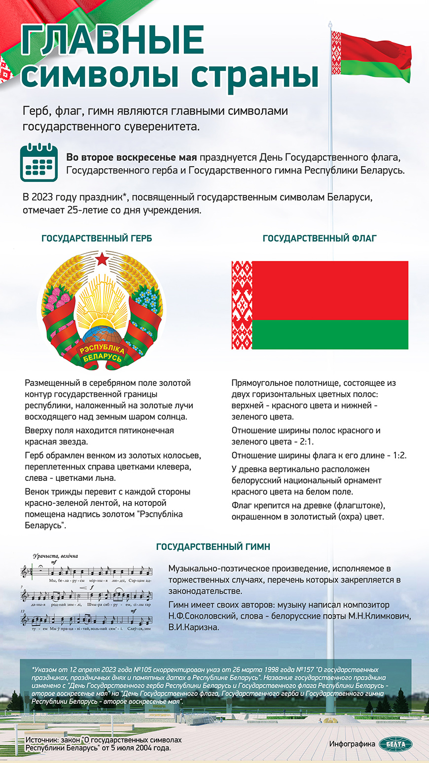 В соответствии со статьей 19 Конституции Республики Беларусь символами нашей страны как суверенного государства являются Государственный флаг, Государственный герб и Государственный гимн. Это символы исторической памяти, которые связывают воедино героическое прошлое, настоящее и будущее белорусского государства. Они являются важнейшими атрибутами суверенитета и независимости Отечества.