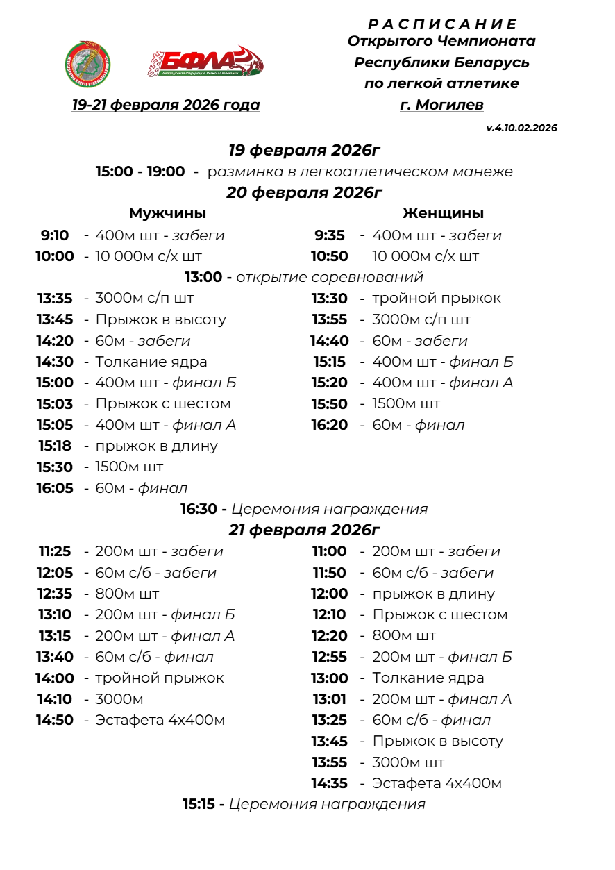 Торжественная церемония открытия запланирована на 13:00. Вход в спорткомплекс «Олимпиец» для зрителей свободный. Для тех, кто не сможет присутствовать на трибунах, будет доступна прямая трансляция чемпионата на телеканале «Беларусь 5».