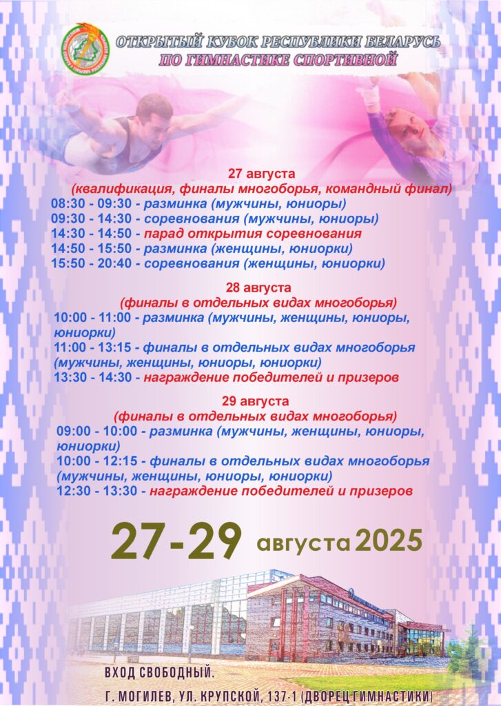 Открытый Кубок Беларуси по спортивной гимнастике пройдет 27-29 августа во Дворце гимнастики Могилева. Об этом сообщили в городской СДЮШОР «Багима» имени О.Г.Мищенко.