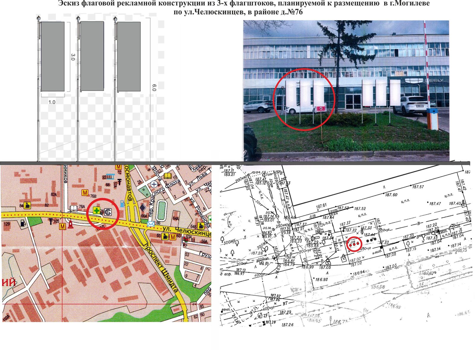 Рекламное поле флаговой конструкции должна быть в размере 3000×1000 мм, с осевым креплением к опоре. Расстояние от уровня земли до верхнего края флаговой конструкции должно быть не более 6300 мм. Флаговая конструкция должна состоять из 3-х флагштоков.