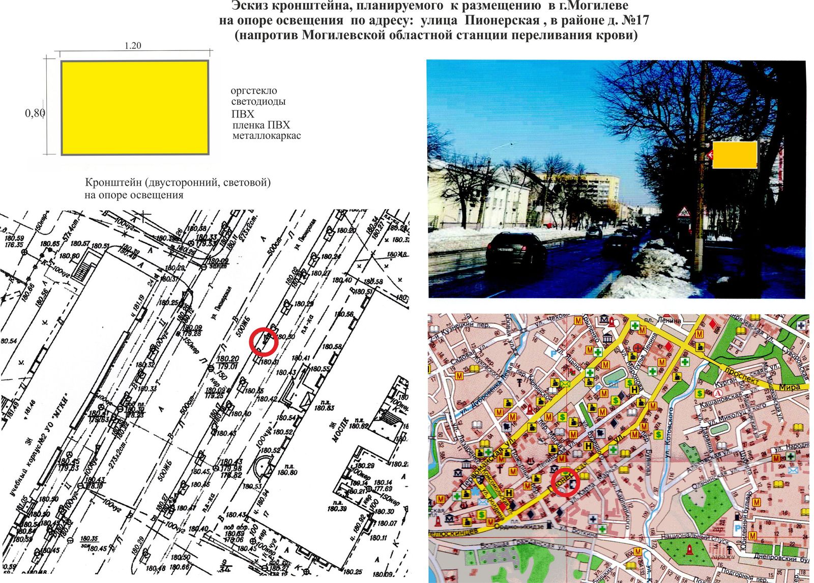 К размещению кронштейнов на опорах наружного освещения или опорах контактных сетей городского транспорта устанавливаются следующие требования; кронштейны должны быть двусторонними (иметь два рекламных поля), с внутренней подсветкой и выполнены в размере 800×1200 мм; кронштейны должны быть ориентированы в противоположную сторону по отношению к проезжей части и закрепляться консольно; выбор горизонтальной или вертикальной ориентации рекламного поля кронштейна определяется в соответствии с геометрической ориентацией ранее размещенных кронштейнов на конкретной опоре и (или) близлежащих опорах; короб кроншнейна должен быть с внутренней подсветкой, обеспечивающей освещенность на поверхности 800 люмен.