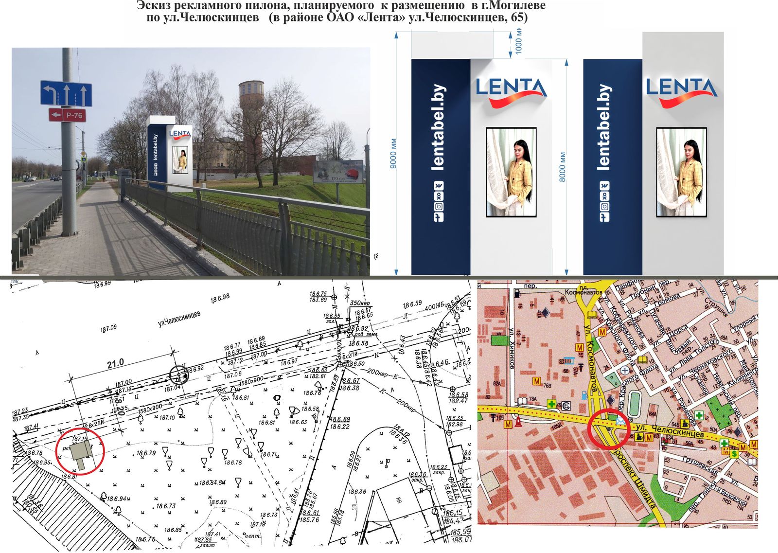 Рекламное поле пилона, закрепленного на земельном участке, должно быть в размере 8000×5200 мм, с осевым креплением опоры к рекламному полю пилона. Расстояние от уровня земли до верхнего края конструкции пилона должно быть не более 8500 мм.