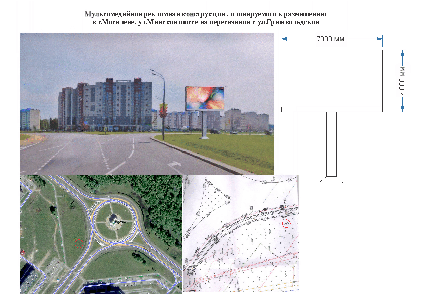- улица Минское шоссе на пересечении с улицей Грюнвальдская, общая площадь - 56 кв.м., размер рекламного поля - 7х4м., площадь рекламного поля - 28 кв.м., количество рекламных полей - 2 ед.;