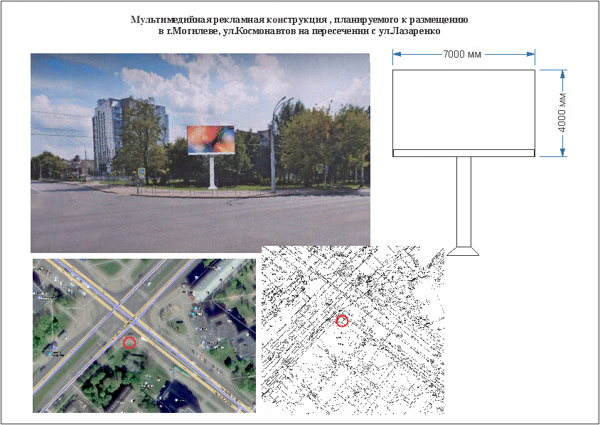 - улица Космонавтов на пересечении с улицей Лазаренко, общая площадь - 28 кв.м., размер рекламного поля - 7х4м., площадь рекламного поля - 28 кв.м., количество рекламных полей - 1 ед. (с условием демонтажа существующей конструкции)